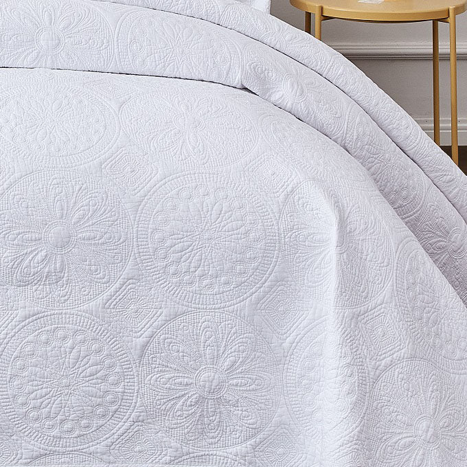 Classic Quilts Embroidered Vivid White Super King Coverlet Set features a solid white circular floral embossed design on a white background. This set includes matching pillowcases. This coverlet reverses to the same design as the front.