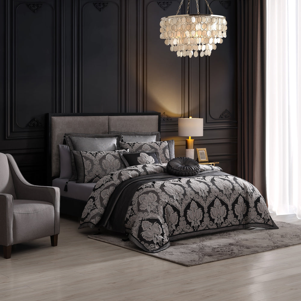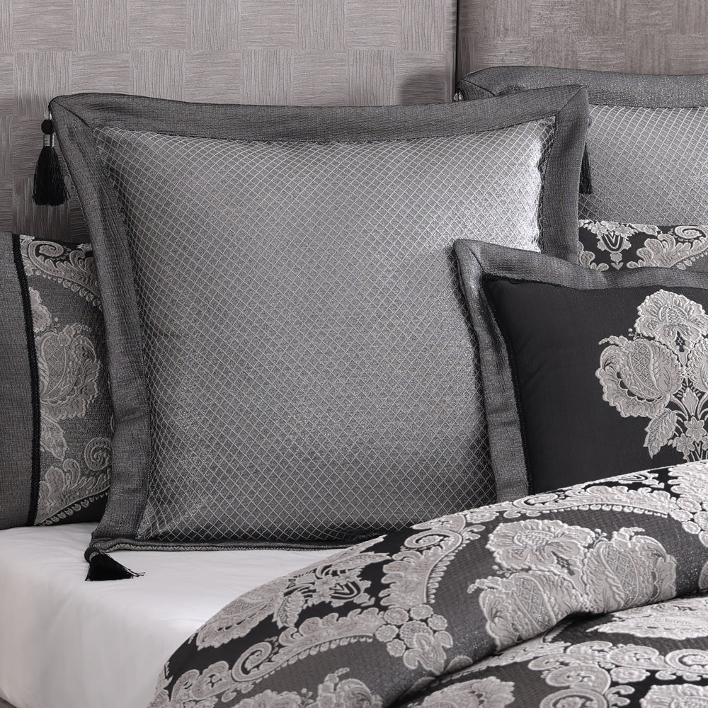 Davinci Emerson Granite Super King Quilt Cover Set is a quilt cover set that exudes sophistication and luxury with the exquisite fine details and use of the soft champagne and black colours. This beautiful woven jacquard damask is rich in texture and shine. The coordinating fabrics highlight an embroidered harlequin pattern and the metallic lurex texture. Metallic guipure lace inserts and deluxe tassels are the final eloquent touch to this collection.