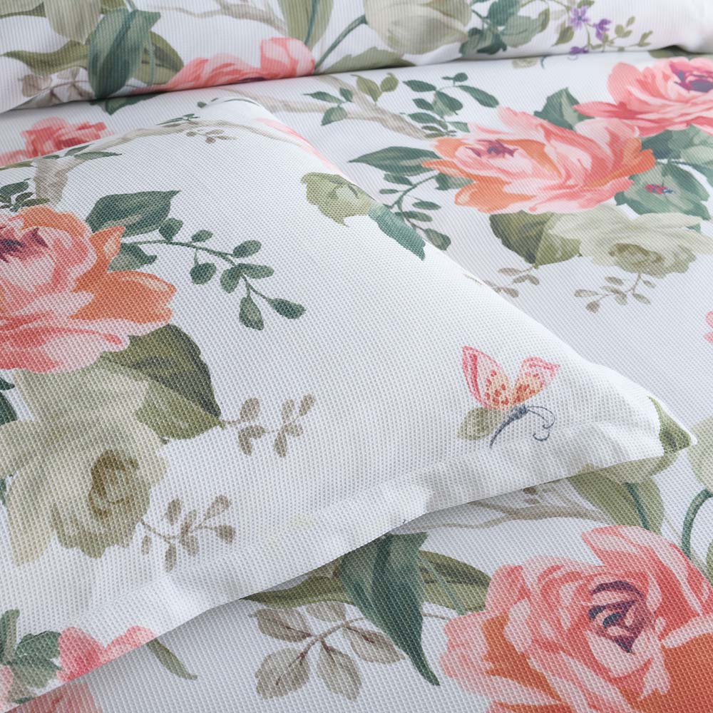 Bianca Elegance English Rose White Queen Bed Quilt Cover Set enjoys a spread of stunning rose bouquets printed on beautiful cotton waffle. These pink roses have been perfectly contrasted against the white background with small butterflies and bees frolicking amongst the flowers.