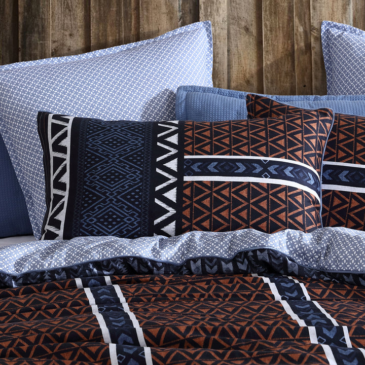 Elevate your bedroom with the Erskine King Bed Quilt Cover Set, a sophisticated blend of contrasting hues and intricate patterns. The design features bold blocks of indigo blues and rich chocolate tones that create a striking visual contrast, while tribal influences lend a touch of cultural artistry to the mix. Framing the quilt cover set are elegant top and bottom border prints that enhance the overall design. On the reverse side, discover a subtle slate and white geometric print that provides a serene and understated counterpoint to the vibrant front. Expertly crafted, the Erskine quilt cover set offers both style and versatility, transforming your space into a refined retreat.