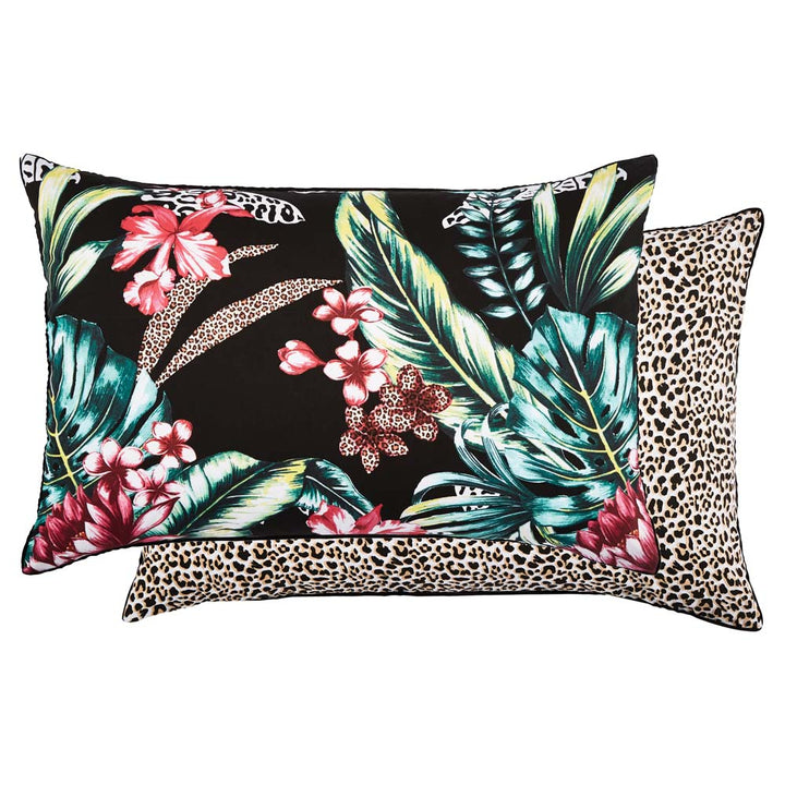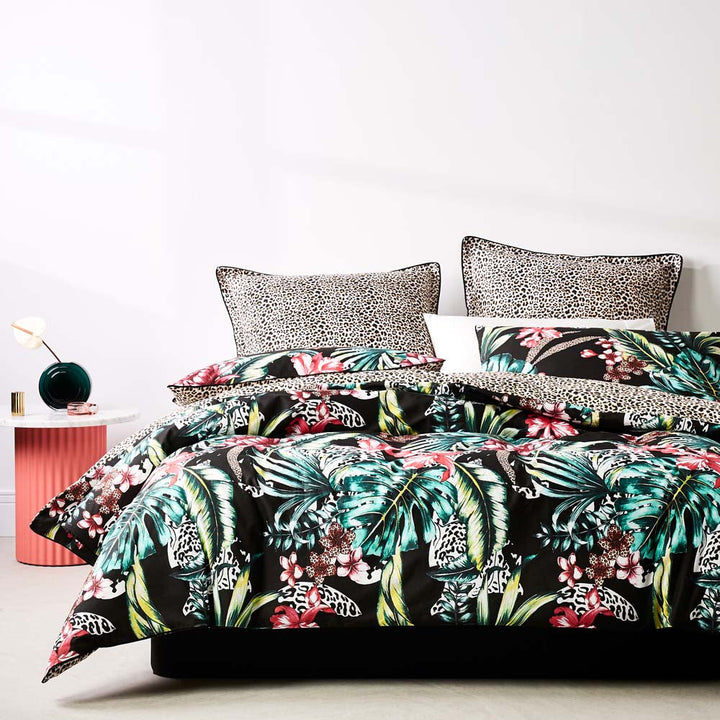 Logan and Mason Etta Black Double Bed Quilt Cover Set is a lush, botanical story that fuses tropics with a menagerie of hidden exotic animals. The beautifully illustrated foilage is vibrantly coloured against the black ground. The cover reverses to all-over leopard rosettes for co-ordinated contrast.