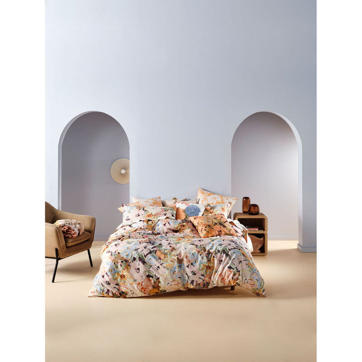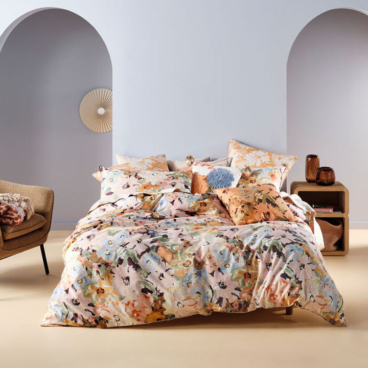 Linen House Fergie Peony Double Bed Quilt Cover Set is a vibrant, hand-painted floral in hues of peach, apricot, sky and plum, while the reverse enjoys a plain-dyed cream ground. Fergie’s printed cotton design is best paired with its apricot European pillowcases and begs to be surrounded with texture and colour across its coordinating cushions and throws.
