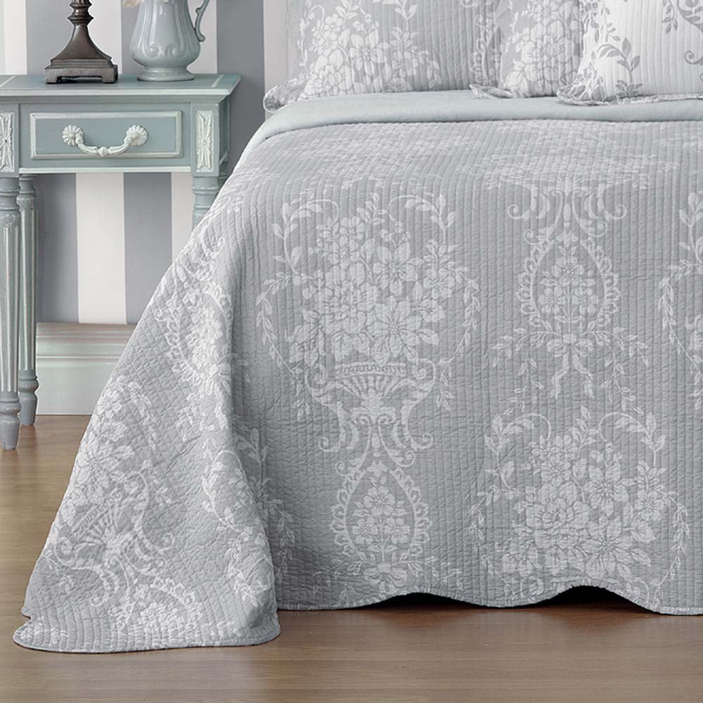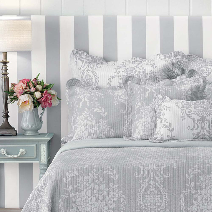 Bianca Florence Grey King Bed Bedspread Set is inspired by a french provincial boudoir and is printed on beautiful soft textured fabric. It features a scalloped edge and coordinate european pillowcases and cushions.