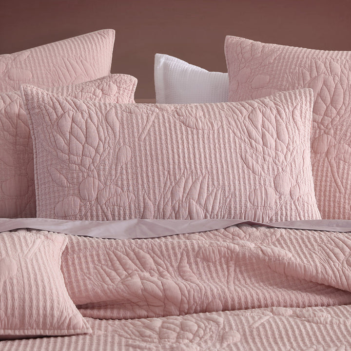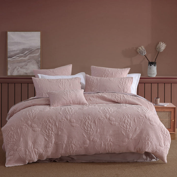 Platinum Logan and Mason Flourish Rose Super King Quilt Cover. Native Australian flora takes centre stage with this design. The quilt cover features stylized Proteas, meticulously quilted to create a dramatic effect against a charming star-like embroidered background. The highly textured fabric adds depth, while the fresh colour Rose has been stonewashed imparting a vintage and weathered aesthetic. Complete with a simple bound edge, Flourish brings a touch of nature’s beauty indoors with a perfect blend of style and comfort.