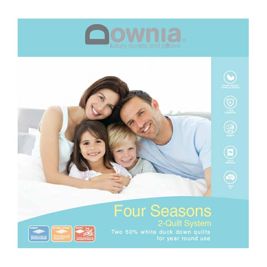 Downia Four Seasons Collection Super King Quilt is made from white duck down and feather and is ideal for year round use. It includes a light weight duvet for summer, and a medium weight duvet for Autumn and Spring. Clip the two together and it becomes a Winter duvet. Sewn through cassette. Downproof cotton casing with 280 thread count fabric.