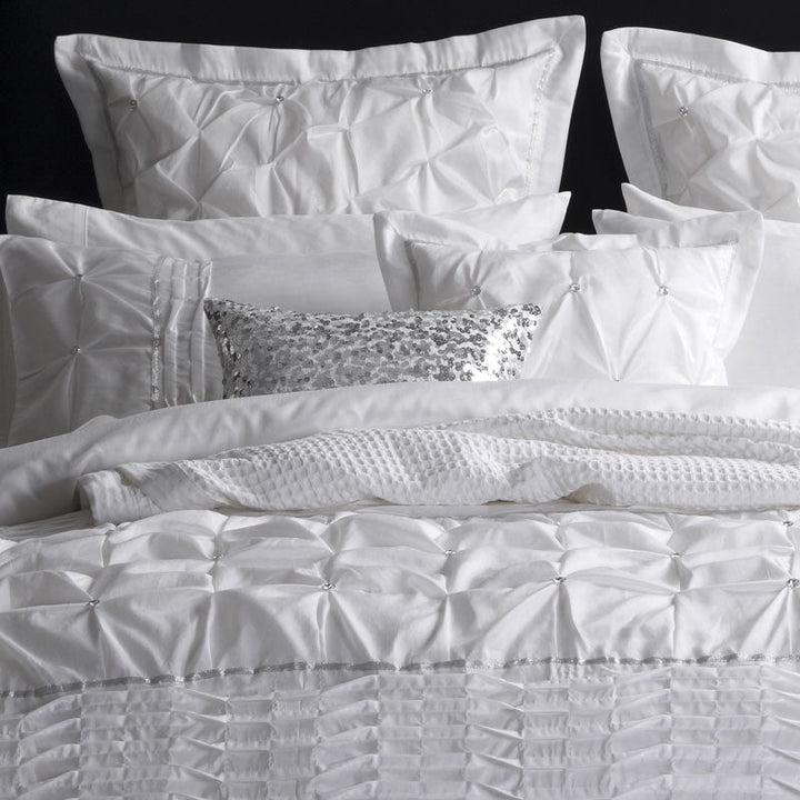 Platinum Logan and Mason Francesca White Square Filled Cushion turns your bedroom into a style sanctuary with the elegant glamour of Francesca. A plain base in classic white contrasts against a panel of decorative gathers and diamante buttons, bordered each side by metallic silver ribbon and panels of twisted pintucks. Also available in chic black and jewel-toned taupe.