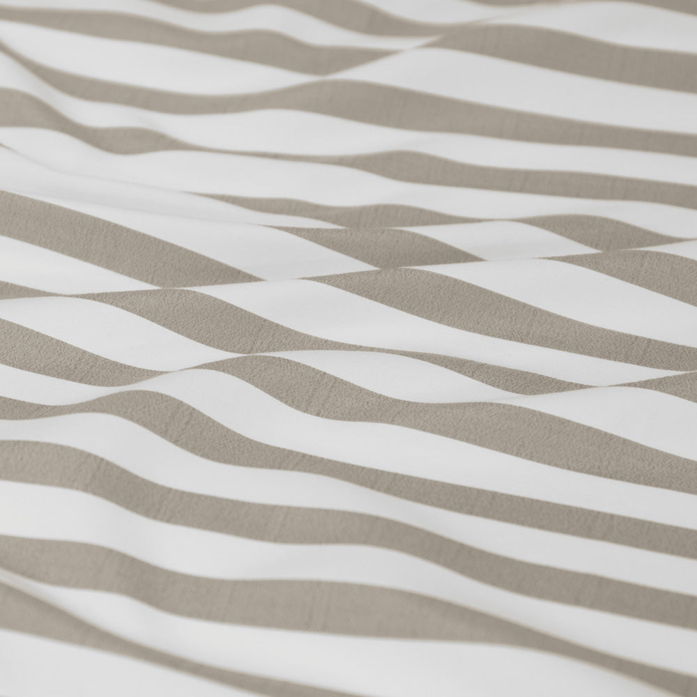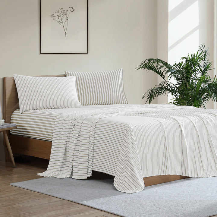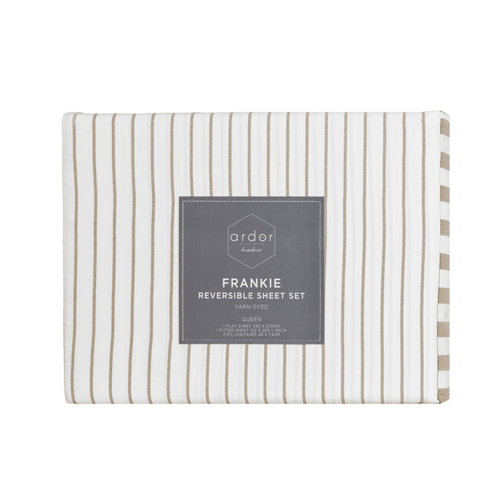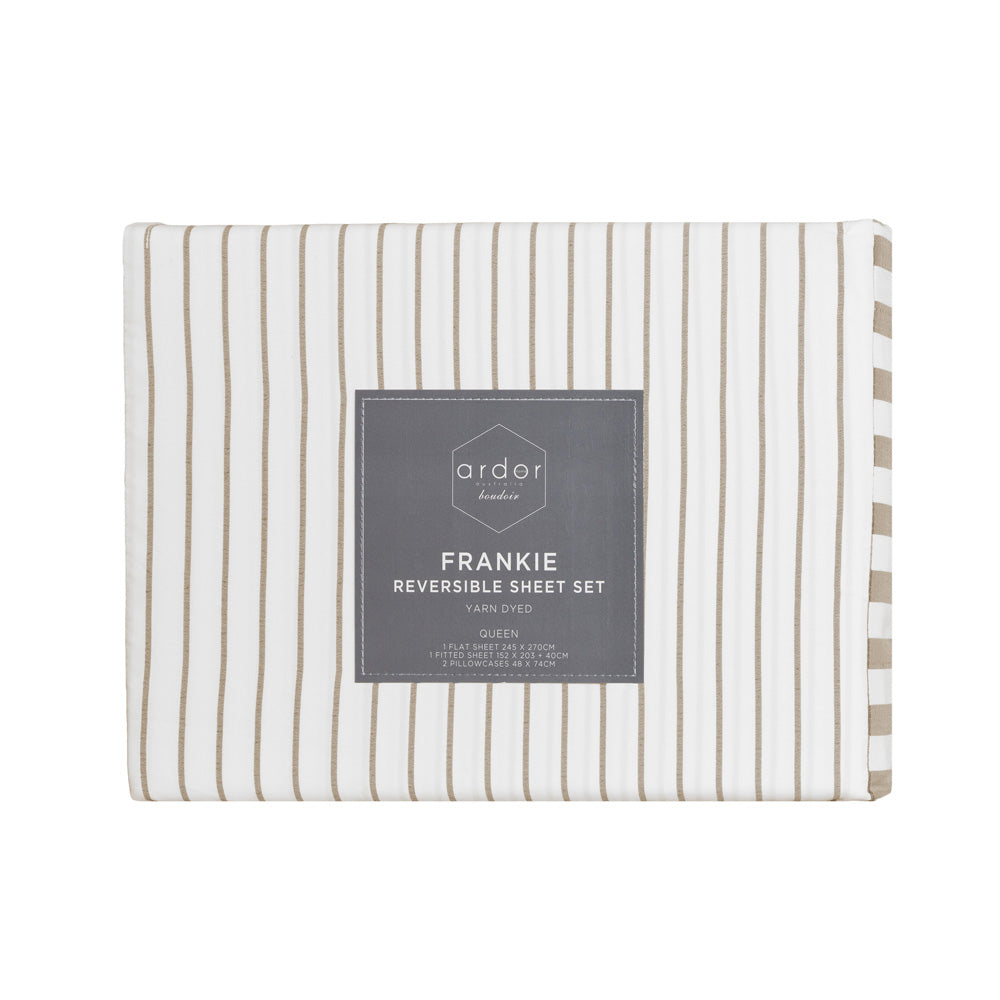 Designed to be the complimentry addition to your bedroom. Frankie Stripe Natural Queen Bed Sheet Set features subtle stripes that help ground your bedroom style in a realm of relaxtion and sophistication.