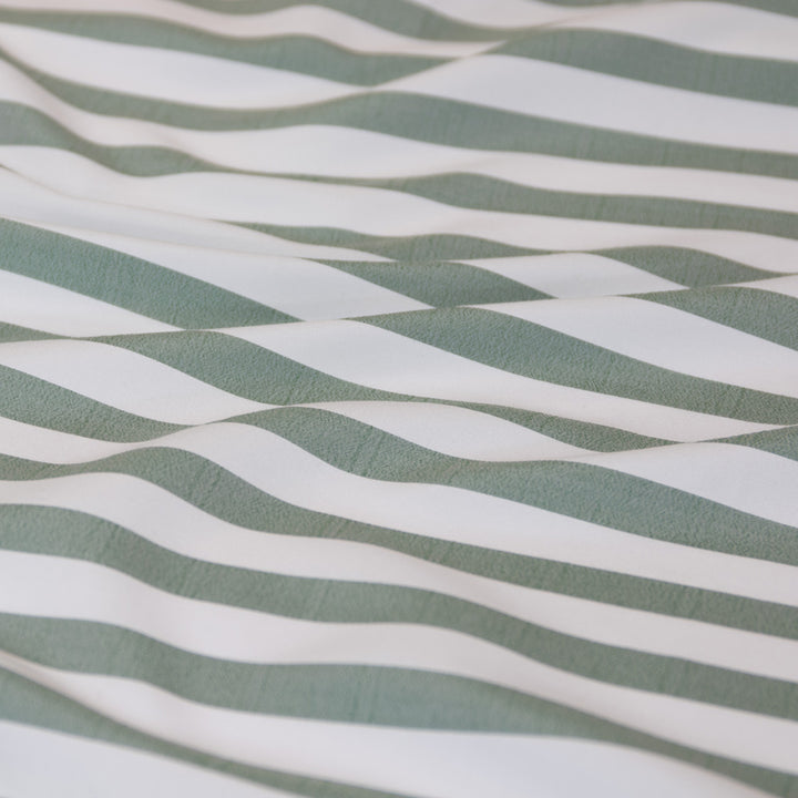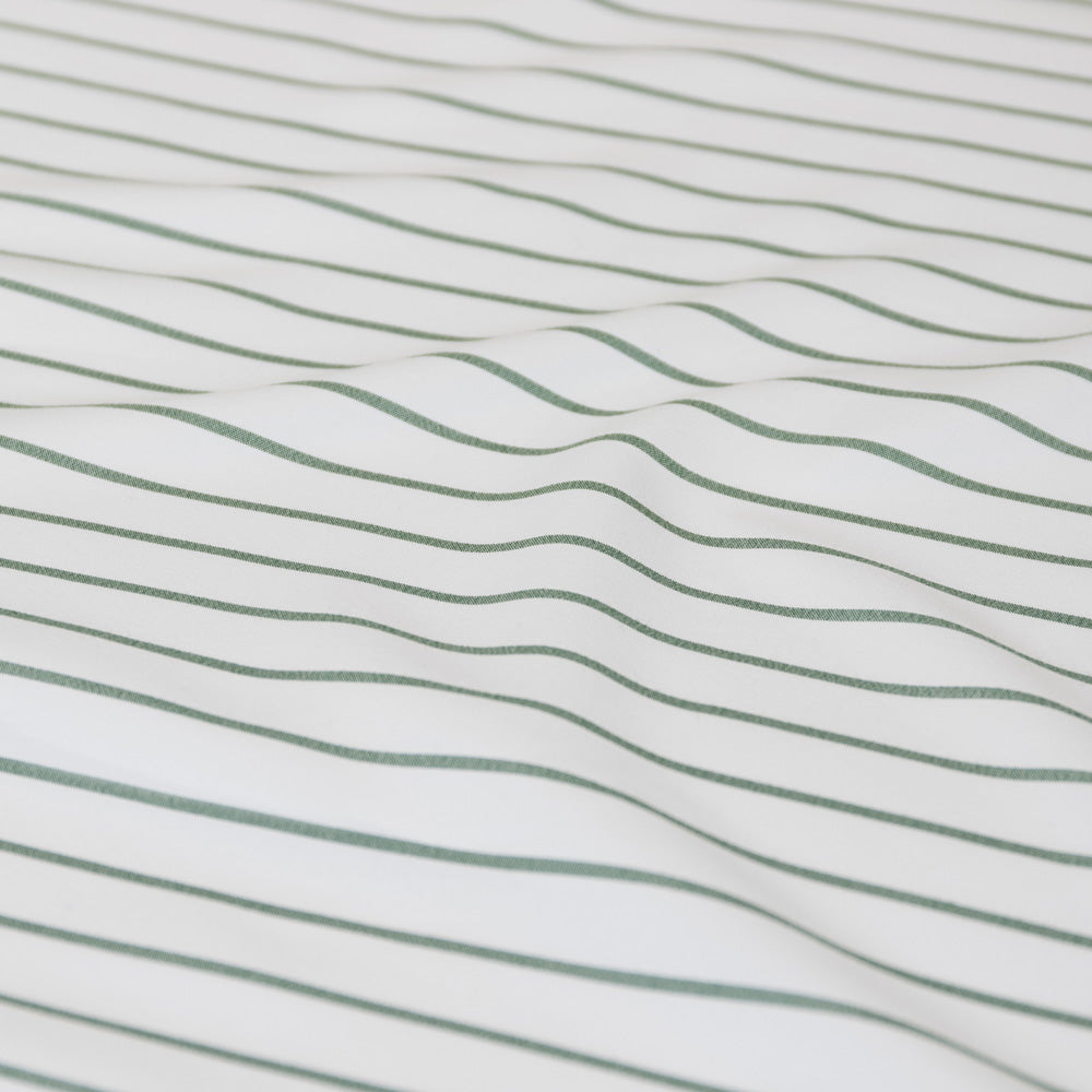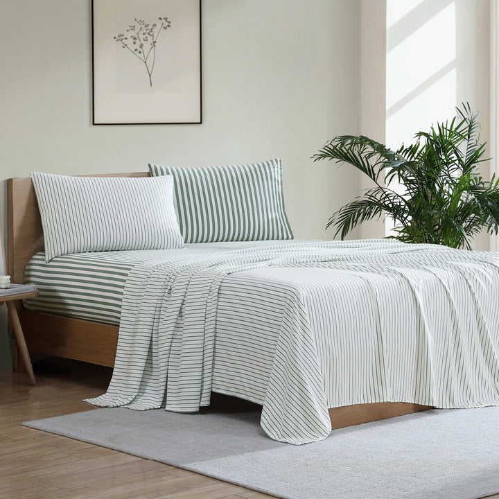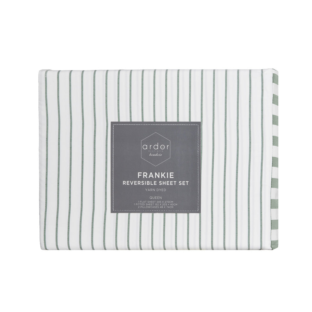 Designed to be the complimentry addition to your bedroom. Frankie Stripe Sage Queen Bed Sheet Set features subtle stripes that help ground your bedroom style in a realm of relaxtion and sophistication.