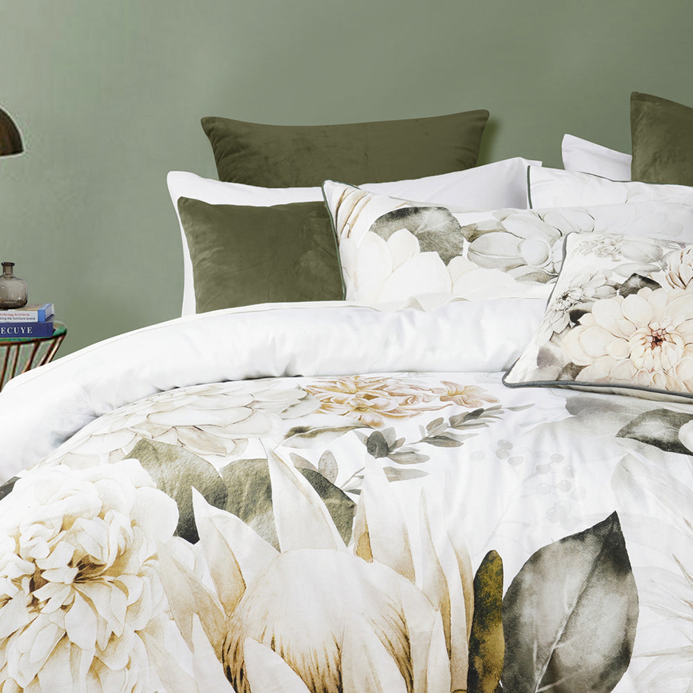 Bianca Giselle White Double Bed Quilt Cover Set features stunning large florals and foliage that sweep over the bed in gorgeous neutral tones featuring a variety of exquisite green hues. Elegantly piped edging in green complements the quilt cover beautifully. The addition of the velvet european pillowcases and velvet coordinate cushion completes the story https://www.youtube.com/embed/RyPugeQxVvM