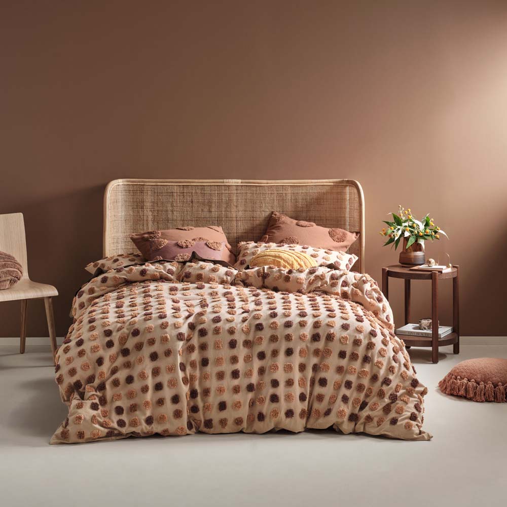 Linen House Haze Pecan Queen Bed Quilt Cover Set enjoys fluffy spots made from tufted cotton chenille in hues of ginger, espresso, nude and pecan browns. This quilt cover set is soft and tactile with marvellous vintage appeal and looks phenomenal when paired with its coordinating tufted European pillowcases and cushion.