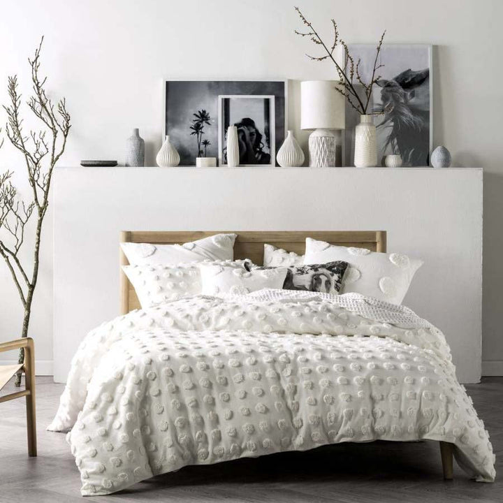 Haze White Single Bed Quilt Cover Set. Charmingly nostalgic, our reinvention of the classic chenille bedspread is simply breathtaking. This creamy white tufted quilt cover and its matching pillowcases are all cotton, wash beautifully and look simply divine when layered with prints or plains.