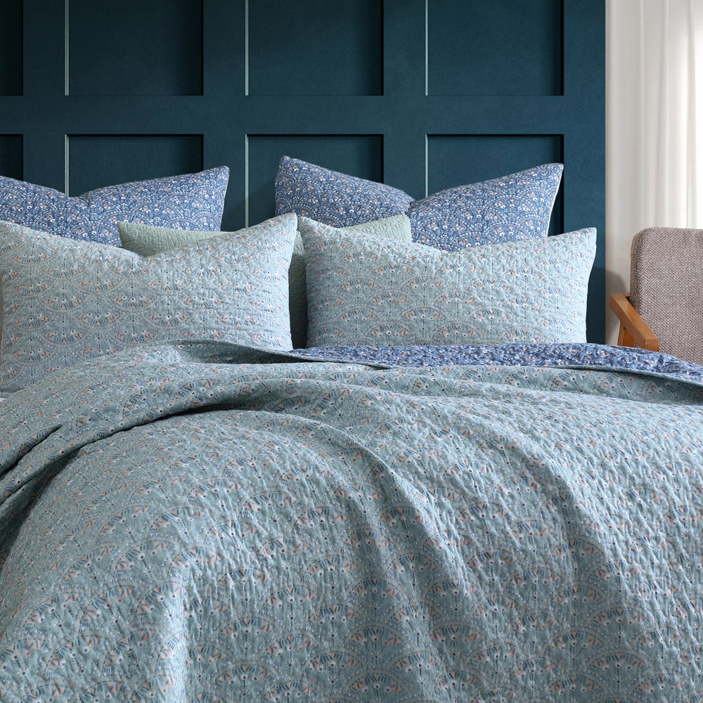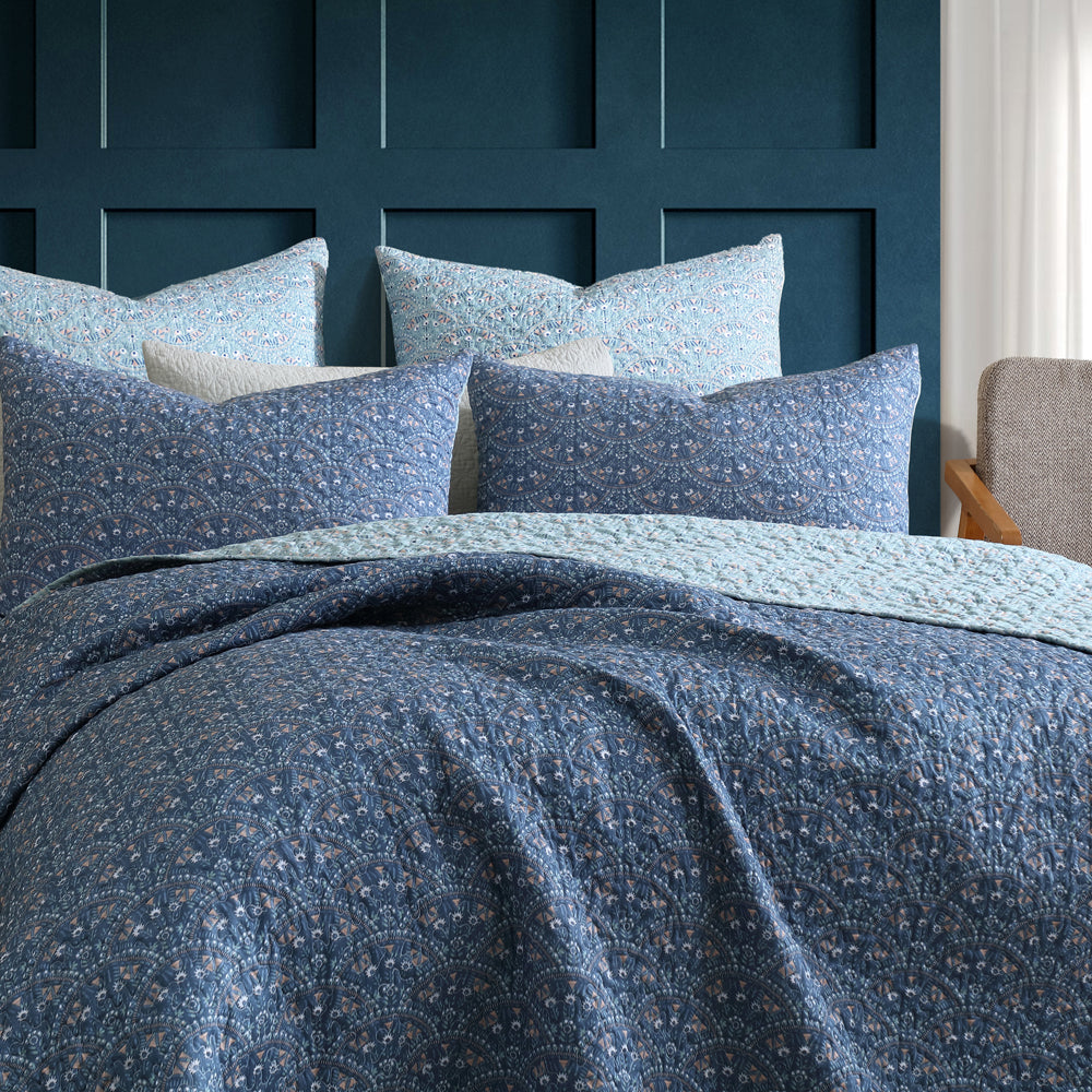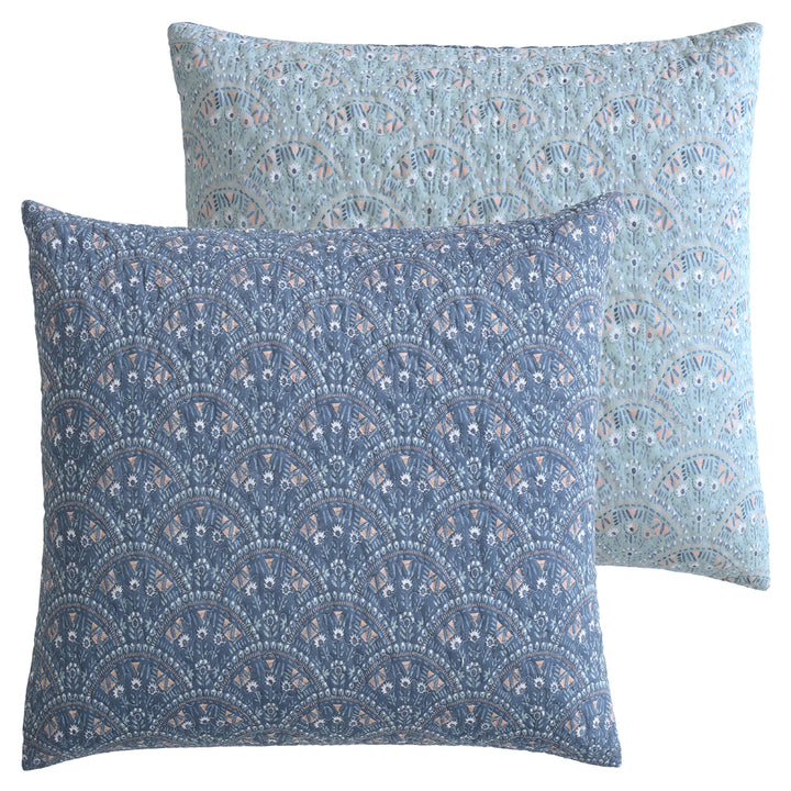 Introducing the Hazel Indigo European Pillow Sham, a masterpiece of watercolor artistry and sophisticated design. The front features a captivating watercolor floral design, elegantly complemented by a fan-shaped pattern that adds a touch of refinement. Set against a deep indigo base, the vibrant hues and organic colors evoke a sense of tranquility and artistic air. Flip the pilllowacse over to reveal a calming moss green reverse, overing a subtle yet harmonious contrast.