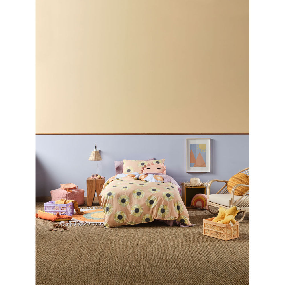 Linen House Kids Hello Sunshine Peach Double Bed Quilt Cover Set features hand-illustrated print on cotton percale. This will delight your little ray of sunshine. Trimmed with cord piping, this set is fully reversible for another colour mood. Finish this garden-themed aesthetic by pairing it with its coordinating sweet novelty cushions.