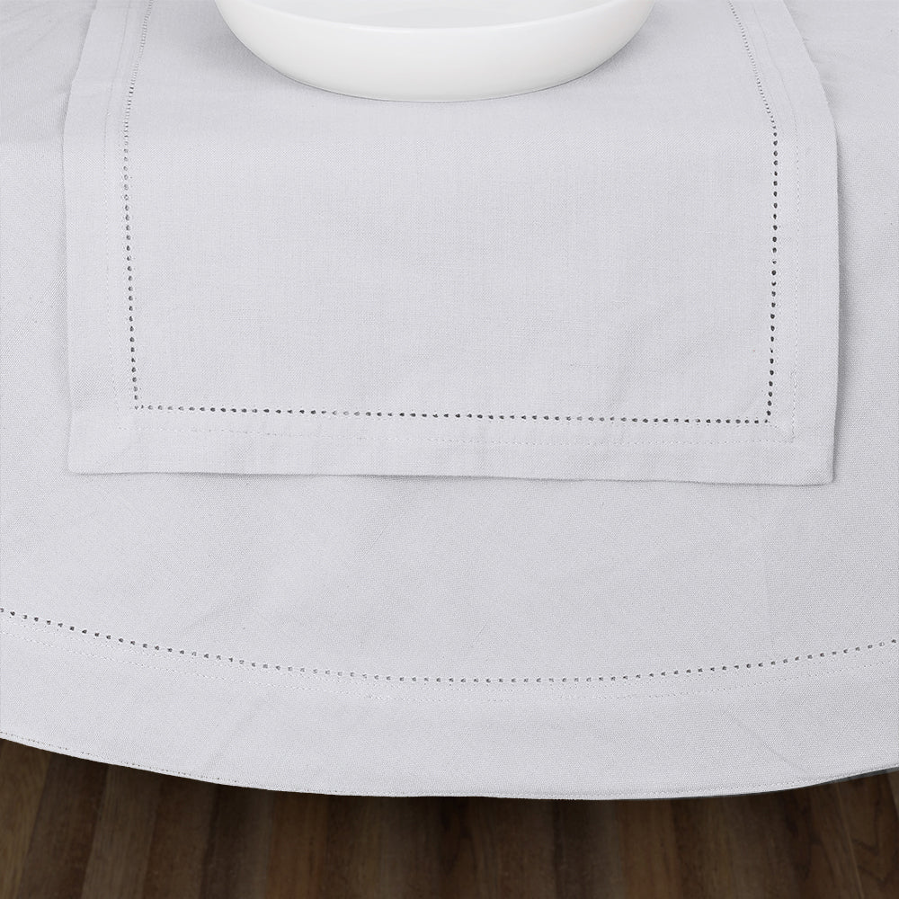Dress up your table with Elegant Hemstitch tableware. This collection will add a touch of sophistication to your dining room. The Elegant Hemstitch Round Tablecloth in White are perfect for that special occasion but don't shy from everyday use in a classy dining room. The simplicity of the design is stylish without clashing with your furniture.