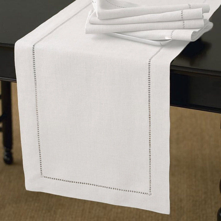Dress up your table with Elegant Hemstitch tableware. This collection will add a touch of sophistication to your dining room. The Elegant Hemstitch Table Runner in White are perfect for that special occasion but don't shy from everyday use in a classy dining room. The simplicity of the design is stylish without clashing with your furniture.
