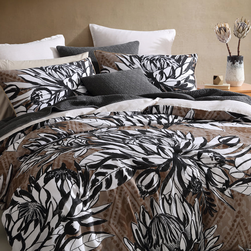 Logan and Mason Hinton Queen bed quilt cover set, where modern elegance meets the beauty of the Australian landscape. Hand-drawn black and white native Protea flowers gracefully bloom on a textured caramel geo print base, creating a striking contrast, while the reverse side features a textured stripe in white and caramel for a sophisticated and versatile ensemble that seamlessly blends contemporary style with natural charm.