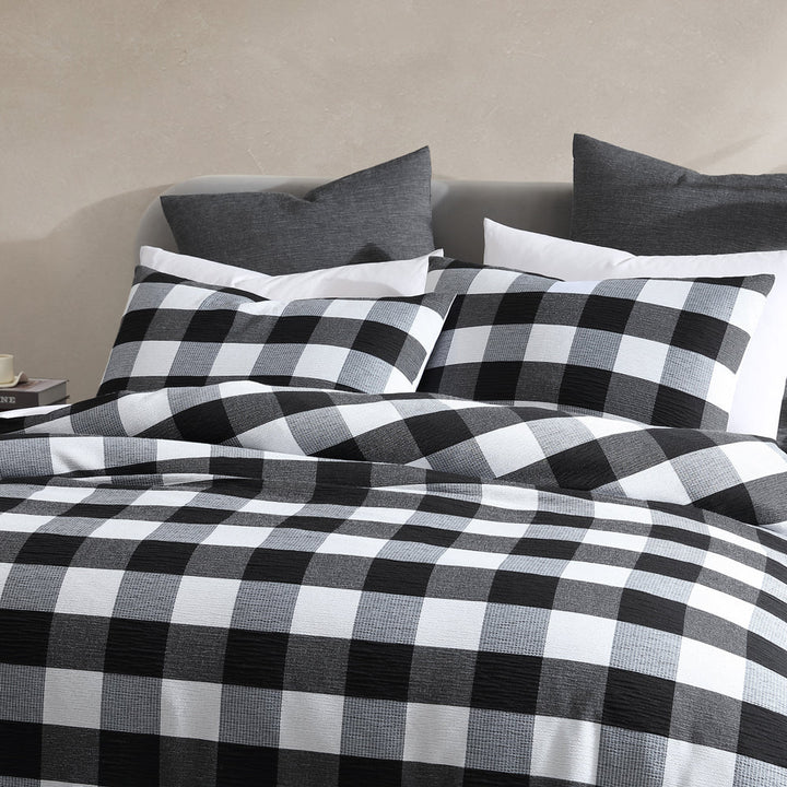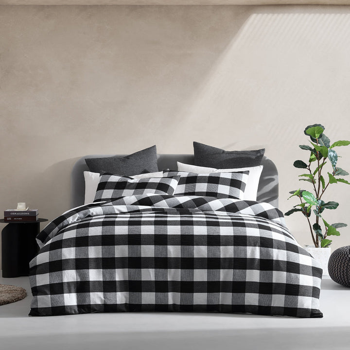 Platinum Logan and Mason Logan Slate Queen Bed Quilt Cover Set, relax in comfort with the casual simplicity of Hogan Slate. Featuring textured squares in a variety of contrasting shades and patterns, Hogan is finished with a tailored flange to create a contemporary, unisex look.