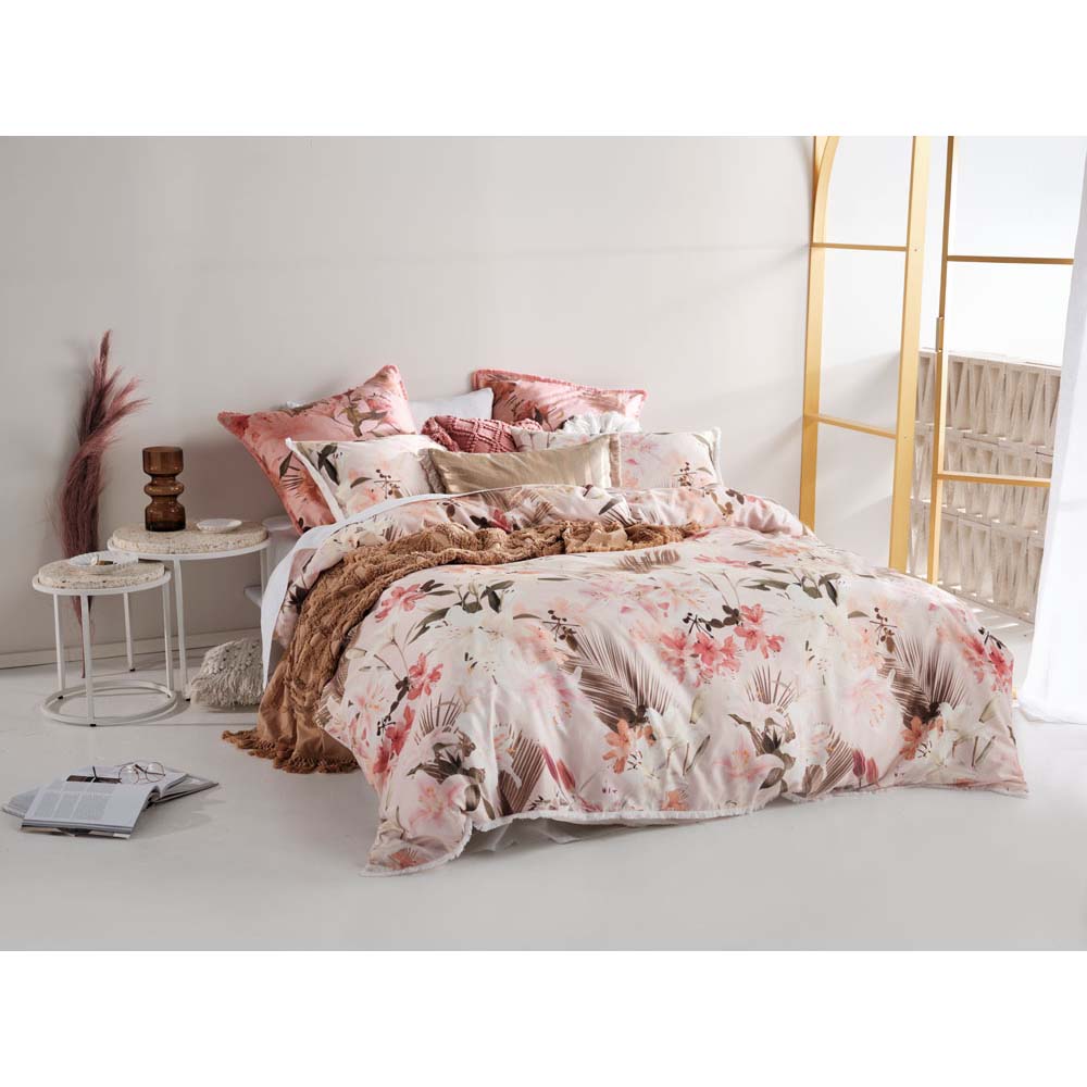 Linen House Holidae Petal Double Bed Quilt Cover Set, ever-endearing, this photographic floral is highlighted by shades of soft pink, coral, chamomile and olive on the loveliest cotton sateen. Holidae's print, which is reminiscent of summer afternoons on a tropical island getaway, is trimmed with white fringing and looks even more alluring with its matching fringed European pillowcases and foil-printed cushion, also with fringing.