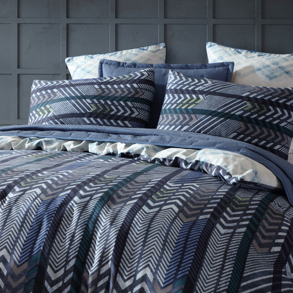 Logan and Mason Homme Double bed quilt cover set offers a dynamic visual appeal with its Chevron stripe design, characterized by a play of textures and captivating colours. The navy and white base, coupled with pops of complementary shades, introduces a sense of depth and character, evoking a contemporary style that resonates with a coastal ambience. Adding to its allure, the reverse side of the Homme quilt cover features a complementary textured Chevron print in soft, soothing light blues.