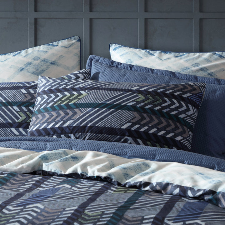 Logan and Mason Homme King bed quilt cover set offers a dynamic visual appeal with its Chevron stripe design, characterized by a play of textures and captivating colors. The navy and white base, coupled with pops of complementary shades, introduces a sense of depth and character, evoking a contemporary style that resonates with a coastal ambience. Adding to its allure, the reverse side of the Homme quilt cover features a complementary textured Chevron print in soft, soothing light blues.