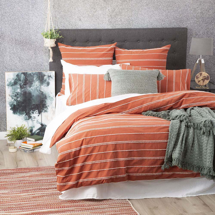 Renee Taylor Hudson Paprika Queen Bed Quilt Cover Set delivers comfortable beauty to an everyday bedroom with this elegant chenille two-one-two striped pattern. Made from a vintage washed cotton with a chenille blend and finished with a cotton reverse, this quilt cover set is the perfect addition to your bedroom style. Coordinate with its matching European pillowcases to complete the entire contemporary look. Oeko-Tex Green certified means that this quilt cover set is also free from harmful chemicals.
