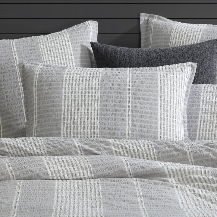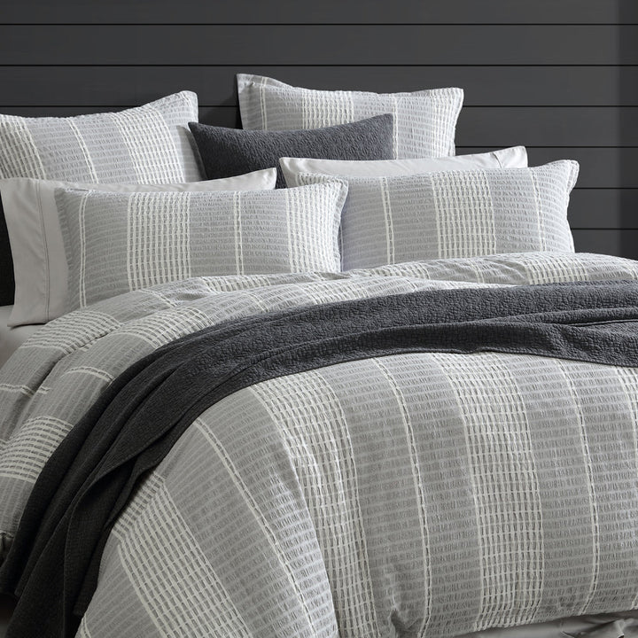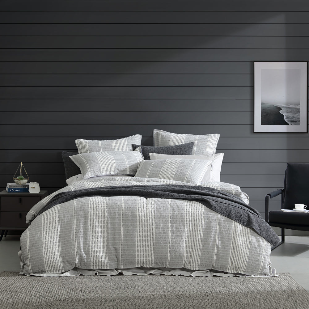 Platinum Logan and Mason Hurley Charcoal Super King Quilt Cover is a stylish quilt cover featuring a graphic stripe design with a subtle matelassé texture. The classic colour combination of Charcoal and White exudes sophistication, bringing a distinctly masculine touch to your bedroom.