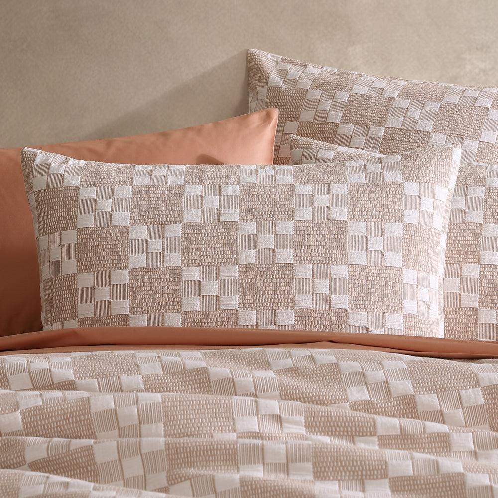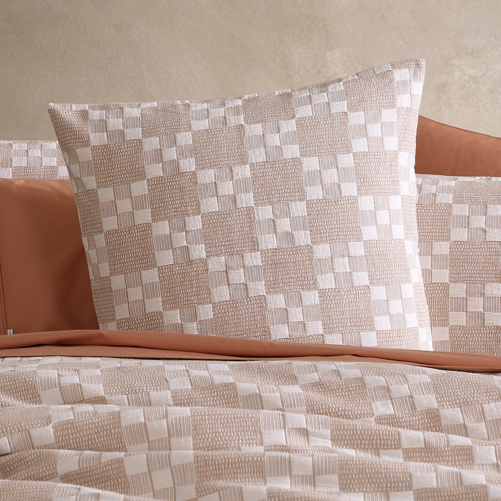 Platinum Logan and Mason Indi Stone Queen Bed Quilt Cover offers a modern reinterpretation of the classic check pattern. Its dramatic design combines small and large squares, enhanced by woven stripes and textures for extra depth. The warm, natural colour palette ensures seamless integration into your interior, adding a touch of contemporary style to your space.