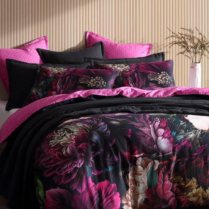 Logan and Mason Inner Sanctum Pink Queen bed quilt cover set, a design that is guaranteed to be a show stopper and transform your bedroom into a moody and romantic palace. Large over scaled florals are placed in layers to create a bouquet flourishing from the centre of the bed. The black background intensifies the tonal purple hues.