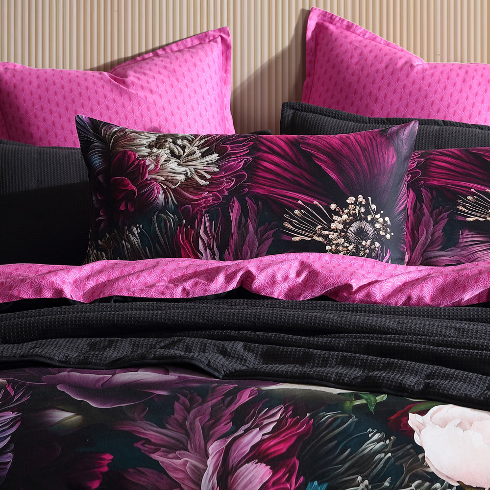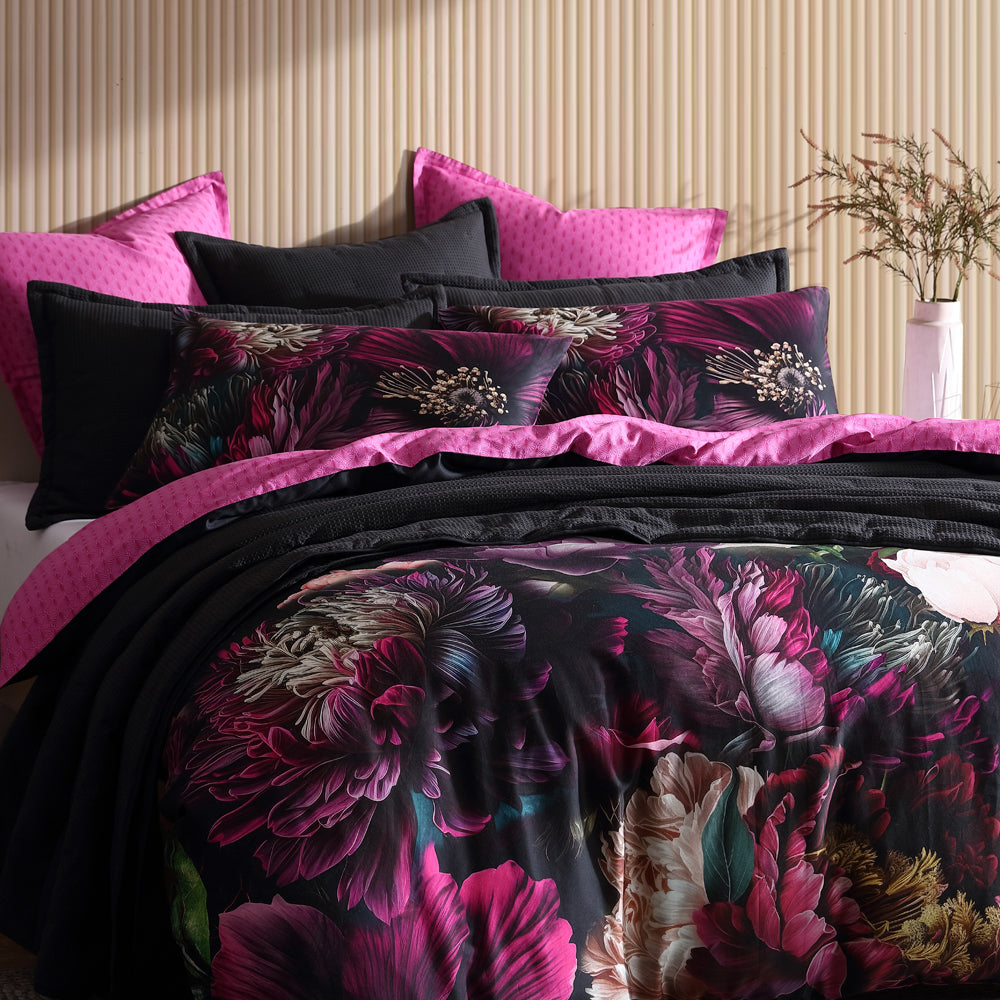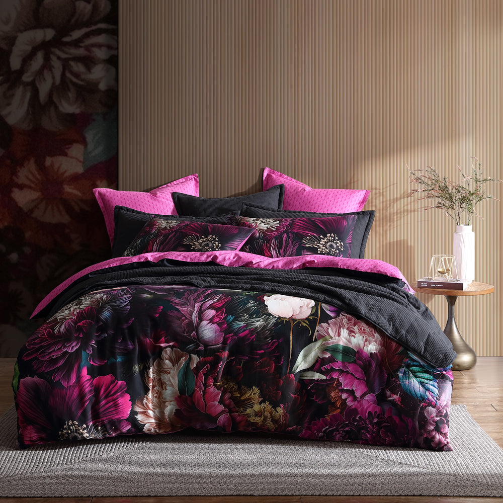 Logan and Mason Inner Sanctum Pink Super King quilt cover set, a design that is guaranteed to be a show stopper and transform your bedroom into a moody and romantic palace. Large over scaled florals are placed in layers to create a bouquet flourishing from the centre of the bed. The black background intensifies the tonal purple hues.