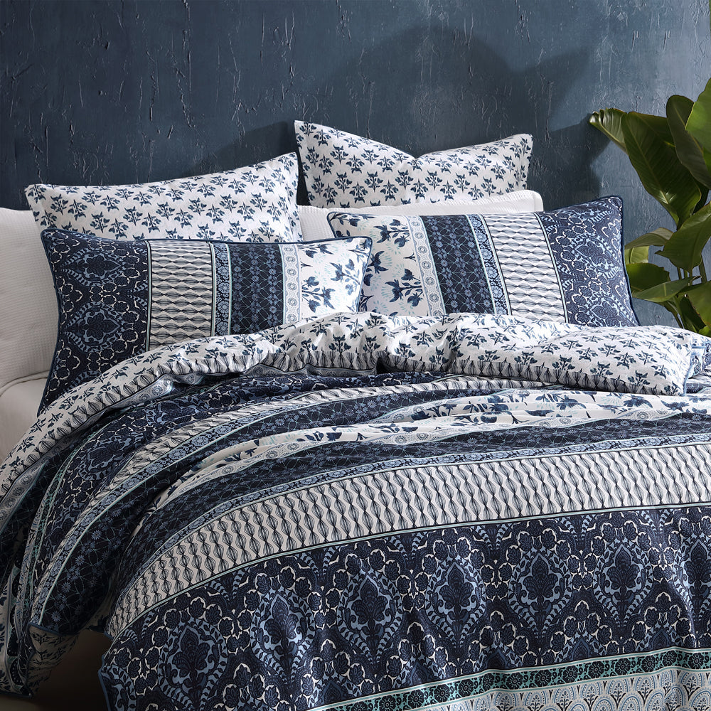 Logan and Mason Into The Blue King bed quilt cover set. Evoking ideas of a bohemian traveller, this design references boho pattern repeats, an assortment of flowers and foliage and geometric designs. Illustrated in a variety of different scale motifs and decorated grounds with small accents, interjected with bands of colours for a fuller look, the overall stripe layout makes this collection a must-have for a breath of fresh air into your bedroom.