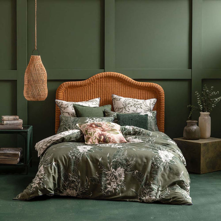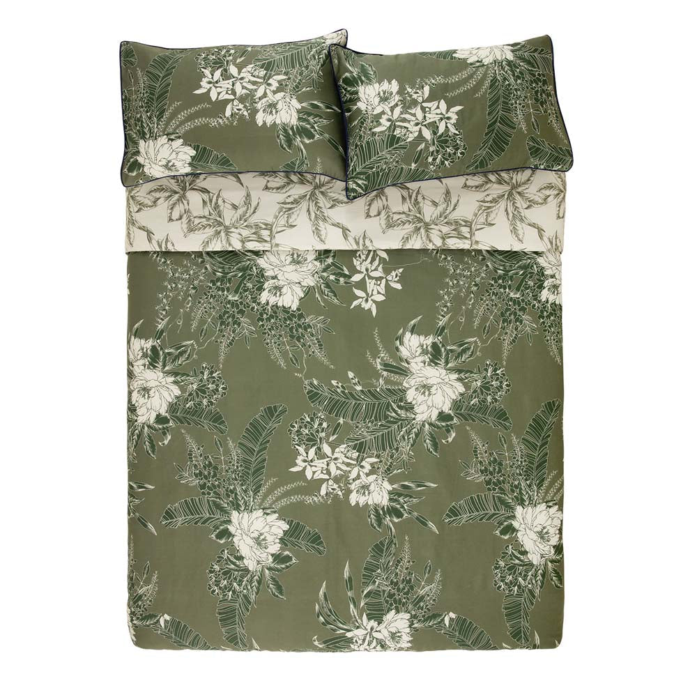 KAS Ivy Multi Super King Quilt Cover Set brings elements of outside in. Crafted from the softest cotton sateen in a stunning olive tone, the cover features a sprawling vine interspersed with elegant white wildflowers. For added depth and charm, the cover features a white vine print reverse edged with modern contrast piping.