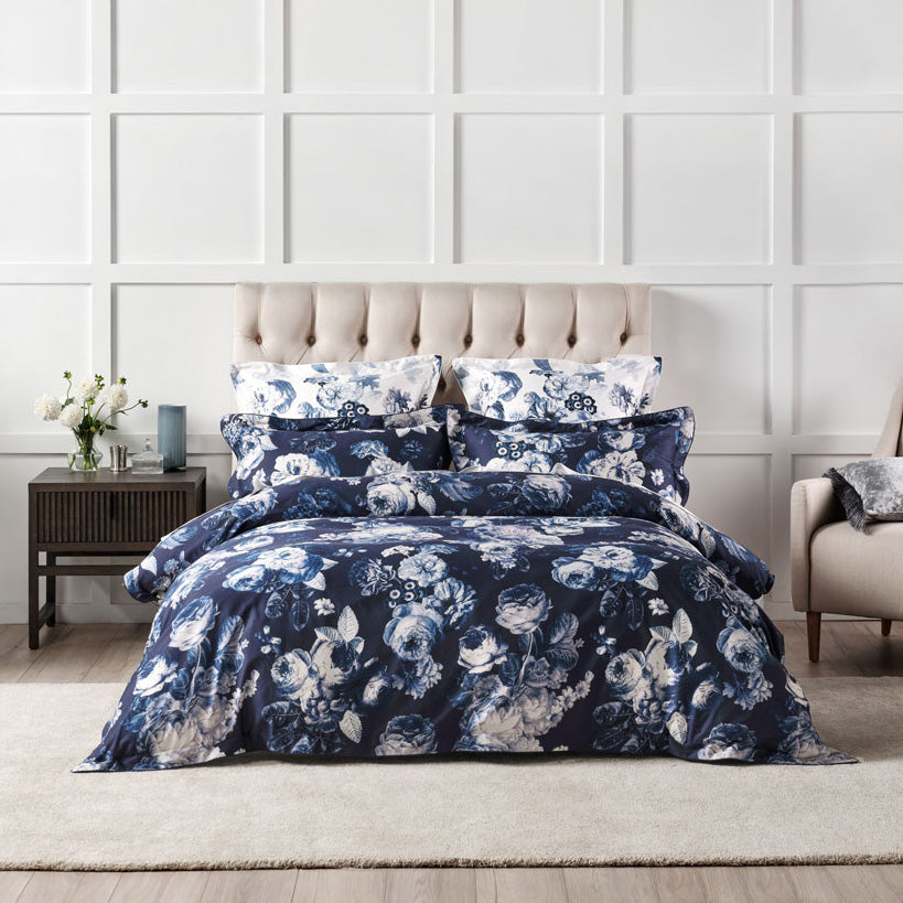 Grace by Linen House Jardin Navy Queen Bed Quilt Cover Set features archival florals in a refined palette of tonal blues on a white ground. This quilt cover set is a magnificent addition to your master bedroom. Printed on luxe cotton sateen to allow superior attention to detail, the set is trimmed with cord piping and features a navy reverse. Accessorise this look with its coordinating European pillowcases and cushions.