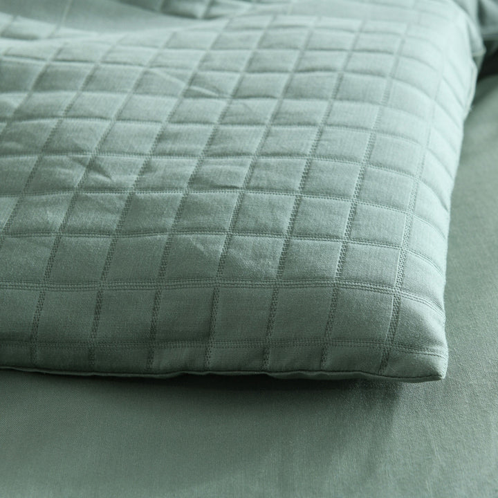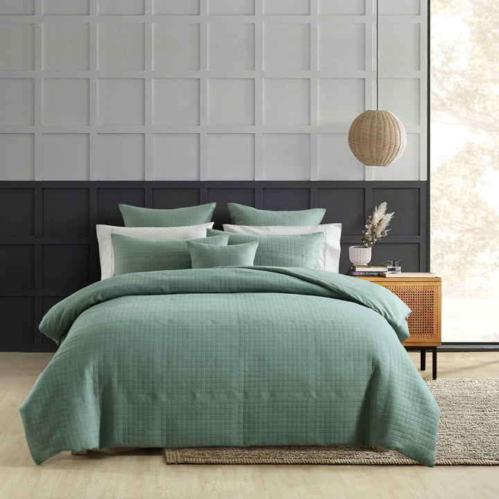 Bianca Jasper Green Double Bed Quilt Cover Set features a contemporary grid design and is woven onto a soft jacquard fabric. This quilt cover is available in popular green tones and exhibits a lovely textured fabric.