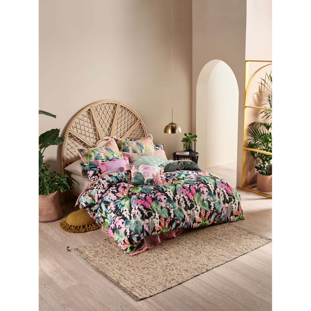 Linen House Jonie Multi Double Bed Quilt Cover Set is your lush botanical paradise awaiting in this hand-painted beauty printed on textured cotton slub. Created in our studio, Jonie is brimming with tropical flora and foliage in a vibrant yet harmonious palette. The set reverses to a plain-dyed deep green hue and looks best with a pair of coordinating fringed European pillowcases and tasseled cushion.