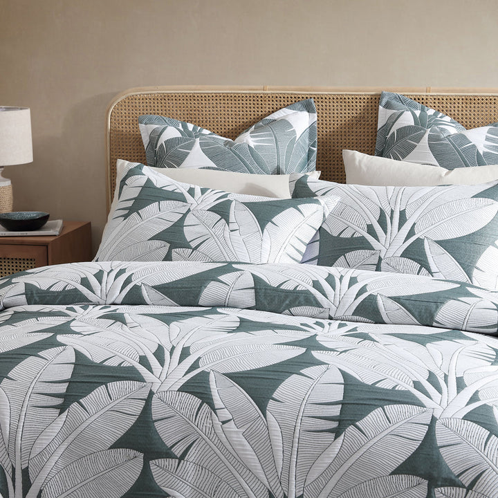 Platinum Logan and Mason Lagos Olive Queen Bed Quilt Cover Set, Escape to an island hideaway with Lagos. Overscaled banana leaves in white pop against the olive ground, creating a tropical story brimming with colour and warmth. Stylishly finished with a tailored edge, Lagos also features co-ordinating european pillowcases to complete the look.