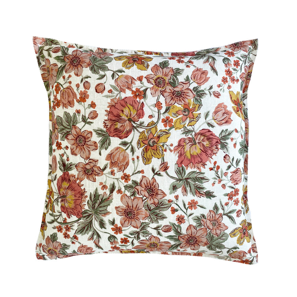 Laura Ashley Lambton Garden Plaster Pink Square filled cushion is a double sided print featuring an abundance of florals such as dog roses, parrot tulips on curving stems.
