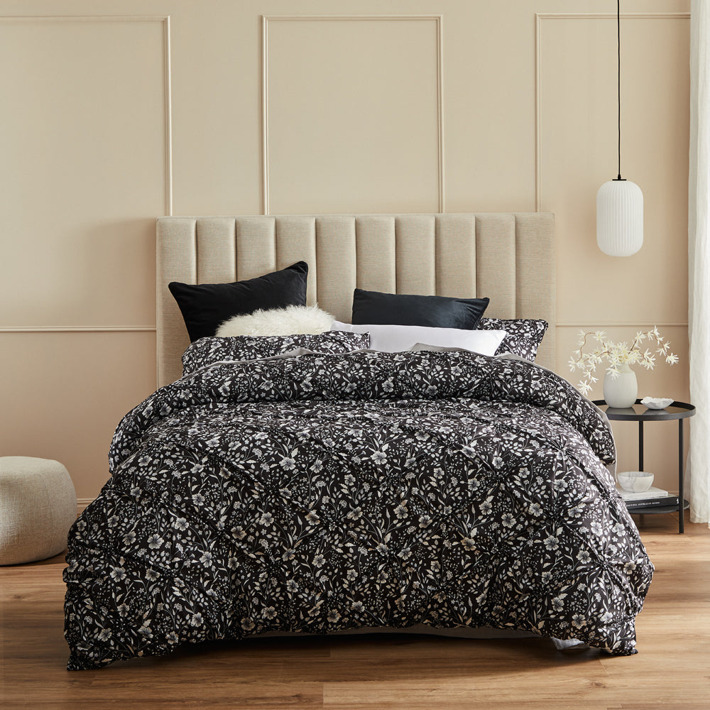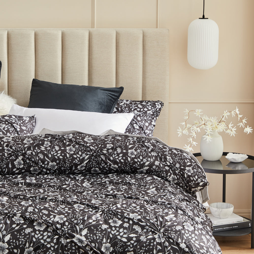 Platinum Logan and Mason Leisel Black Double Bed Quilt Cover Set features monochromatic blooms that are printed, then carefully ruched together to create a textural wonderland. Bolster with Leisel's matching European pillowcases to complete the look.