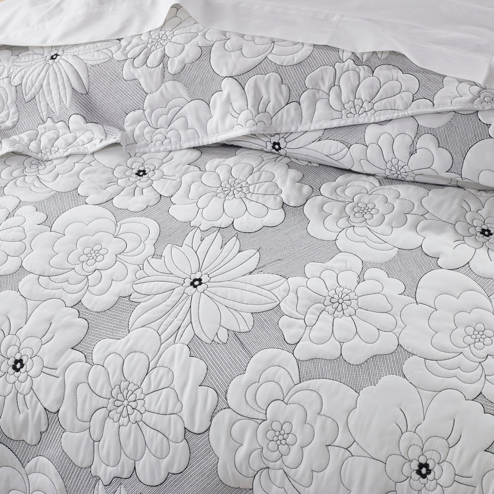 Bianca Leona White Super King Bedspread Set. Make a statement in your bedroom with this striking design. Leona features a floral pattern with black contrast stitching. This 4-piece set includes one bedspread, two standard pillowcases and one cushion cover 43x43cm.