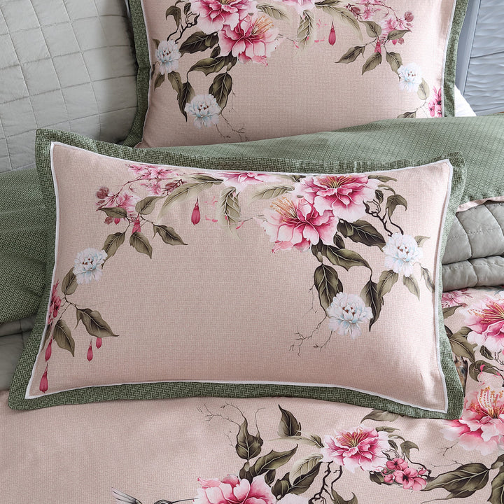 Logan and Mason Lisha Rose Super King quilt cover set uses hand painted oriental blooms and traditional cranes. The eye is drawn across the rambling flowers, featuring hummingbirds, delicate fuchsias and peony blooms. The pink blooms are highlighted by the lush green foliage and pastel ground. The ground and reverse use a traditional oriental style geometric.