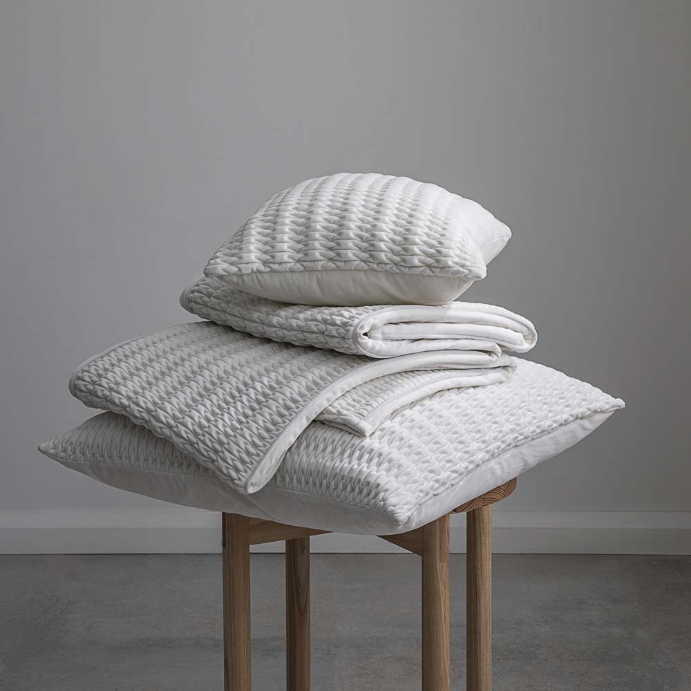 Loxton White Square Filled Cushion combines pattern with tactile softness. Plush velvet is gathered and embroidered into raised stripes, reversing to smooth velvet for visual and textural contrast. The range comprises a European pillowcase, square cushion and bed runner, in four classic colours - black, gold, navy and silver.