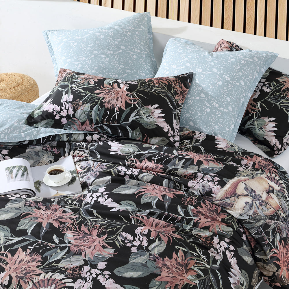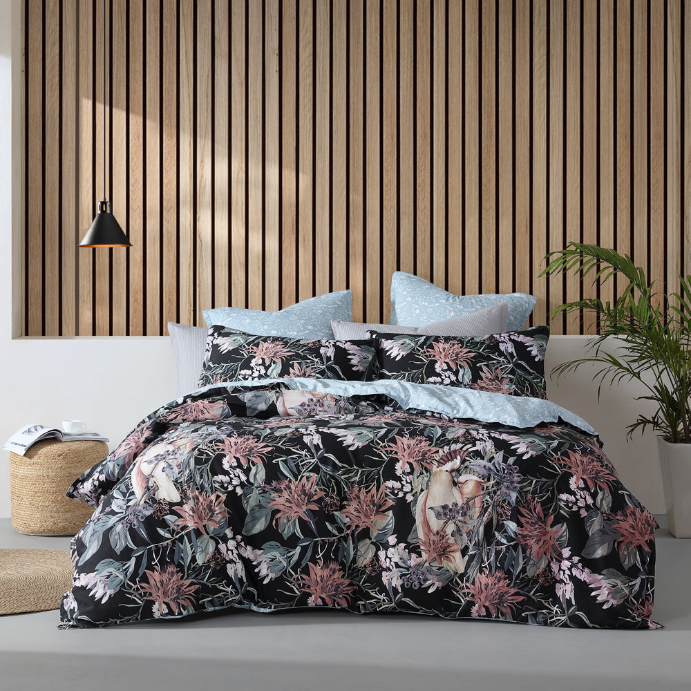 Logan and Mason Major Black Queen Bed Quilt Cover Set is an Australiana flora and fauna design. Hidden amongst trailing wildflowers of desert pinks and lilac and leaves of eucalypt; the vintage art inspired Major Mitchell cockatoo with its red highlights and soft pink give softness to the black ground. The delicate co ordinate reverse of eucalypt balances the design.
