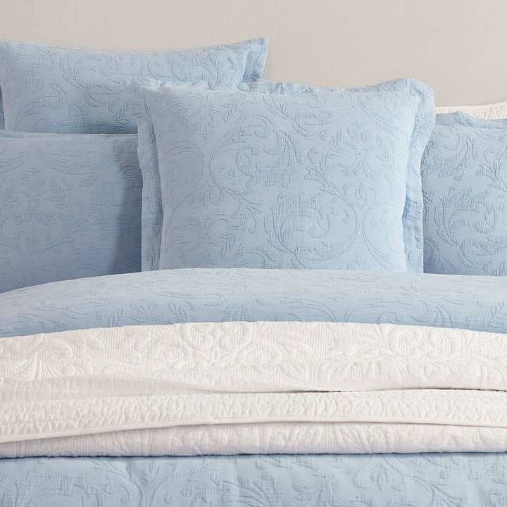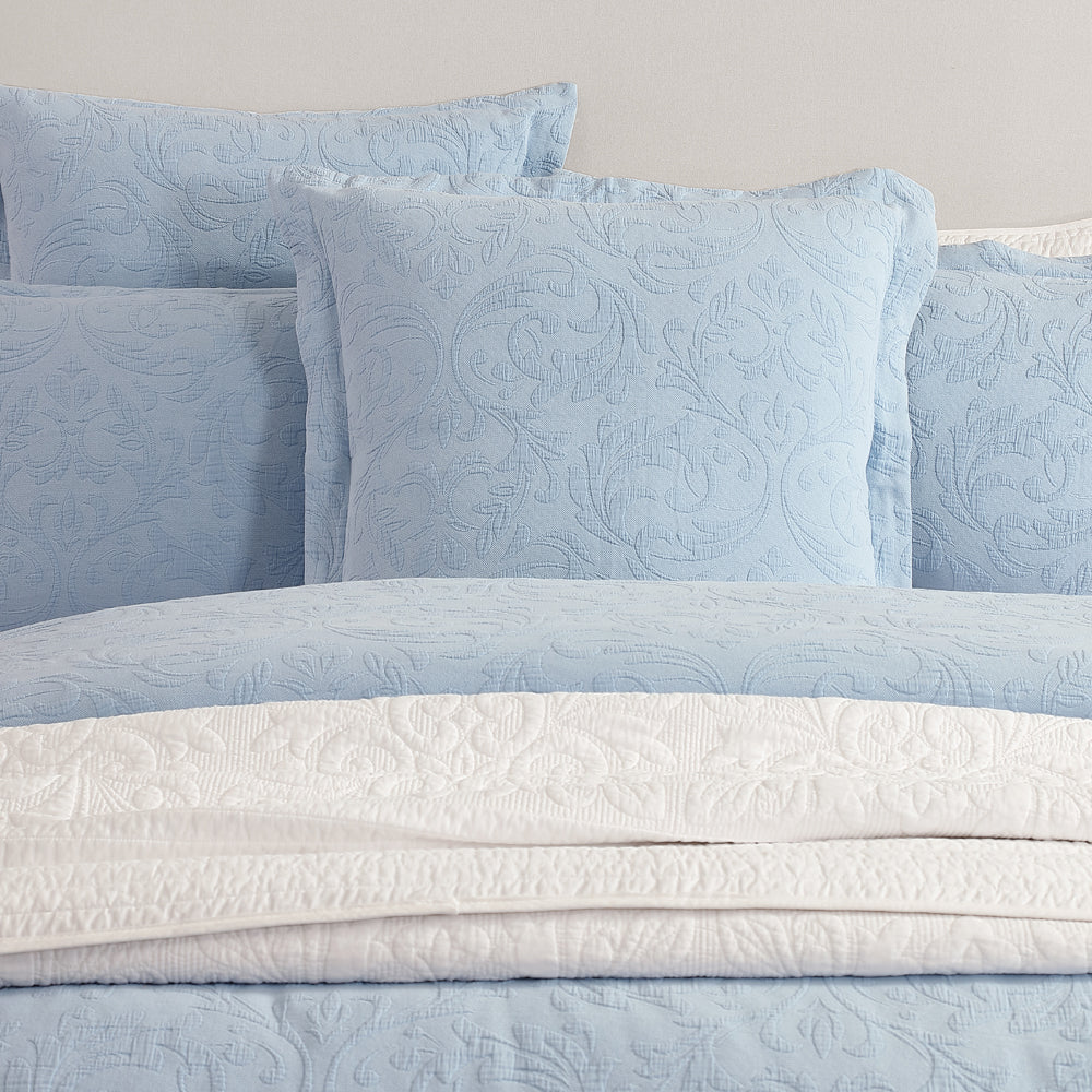 Private Collection Marbella Blue European Pillowcase is a defined modern damask with variations in texture in both the design and background. Stonewashed to achieve a vintage appeal, Marbella is the perfect addition to create dimension to your bedroom. Finished with a simple tailored self-flange this pillowcase is the epitome of luxury.
