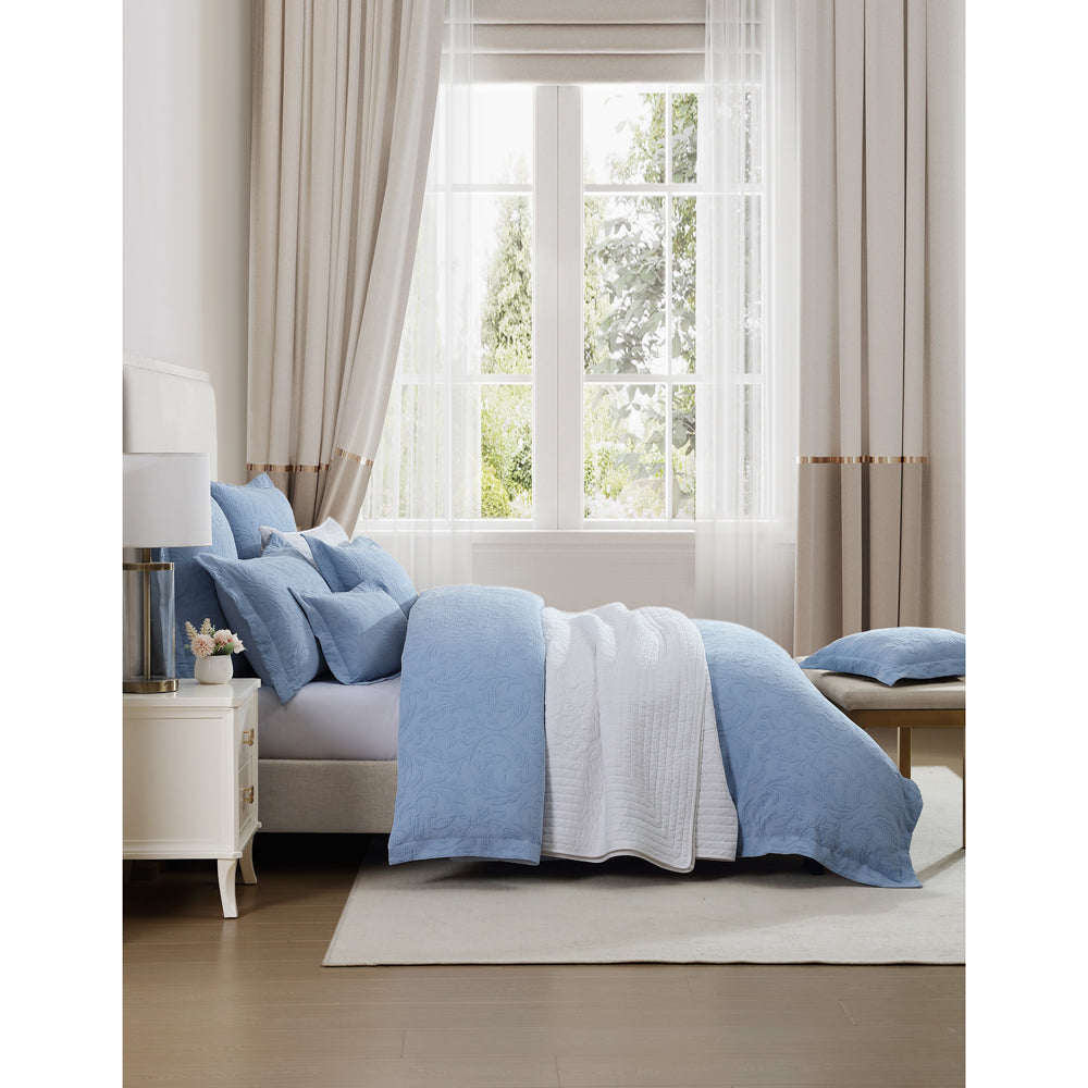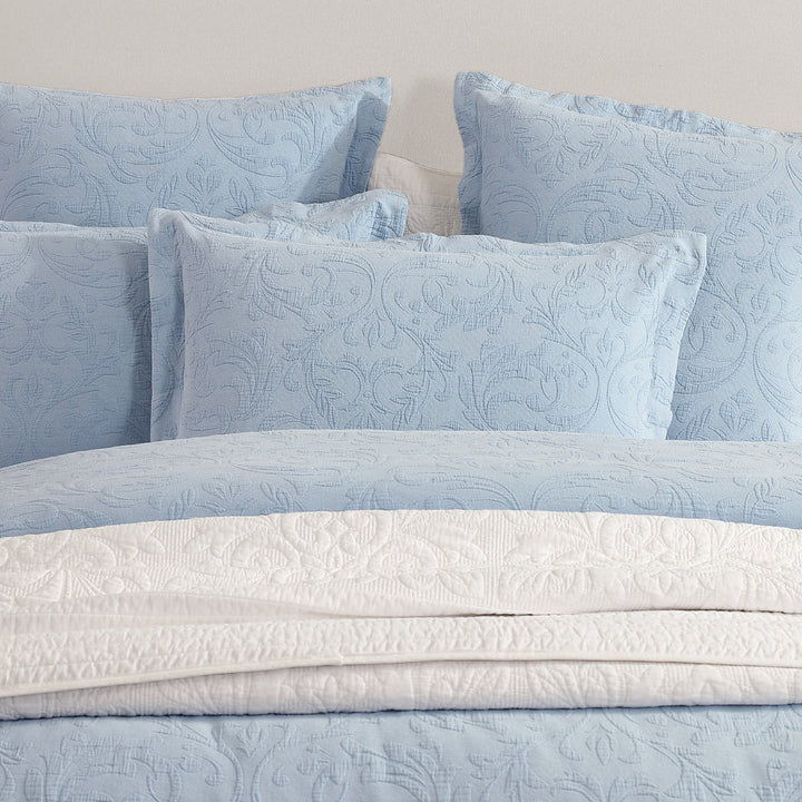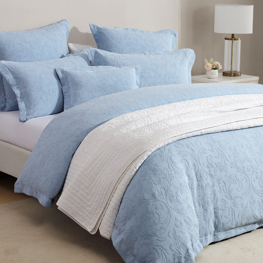 Private Collection Marbella Blue Super King Quilt Cover Set is a crafted matelasse, a defined modern damask with variations in texture in both the design and background. Stonewashed to achieve a vintage appeal, Marbella is the perfect addition to create dimension to your bedroom. Finished with a simple tailored self-flange this quilt coveter is the epitome of luxury.