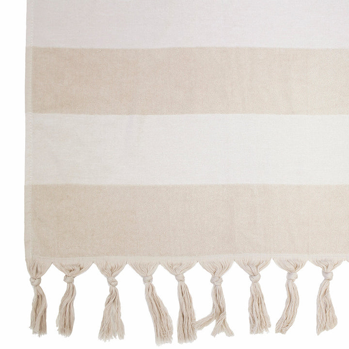 Bambury Marbella Buff Beach Towel is an ideal accessory for the beach or pool; they feature a classic stripe that is made using a high-low pile technique, as well as a velour finish and playful knotted tassels along both ends. The towels are large in size, but lightweight, which makes them compact for travel and quick to dry.
