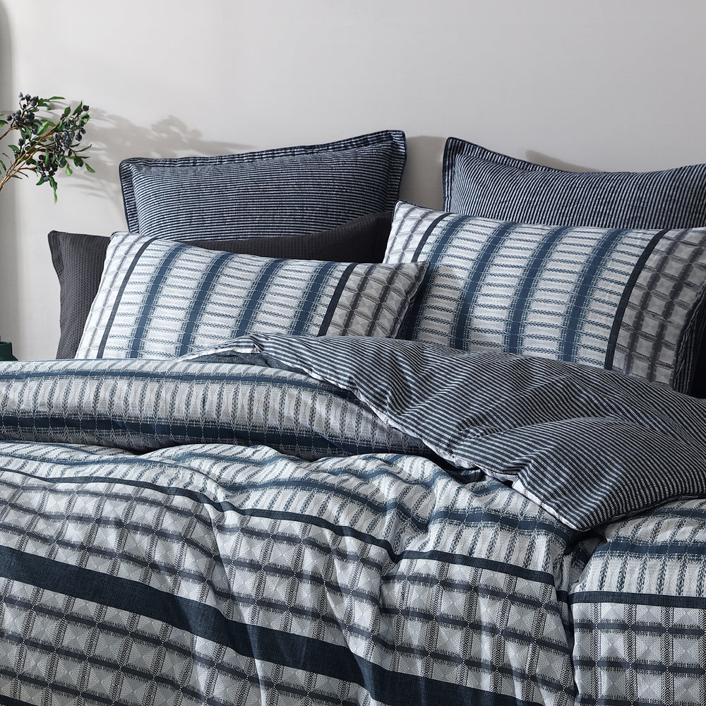 Logan and Mason Mason Indigo Queen Bed Quilt Cover Set is a stylish masculine design for summer, using highly detailed geometric patterns in shades of indigo and grey. An urban look for adding a classic, modern touch to your sleeping space. Pair with matching European pillowcases to complete this contemporary look.