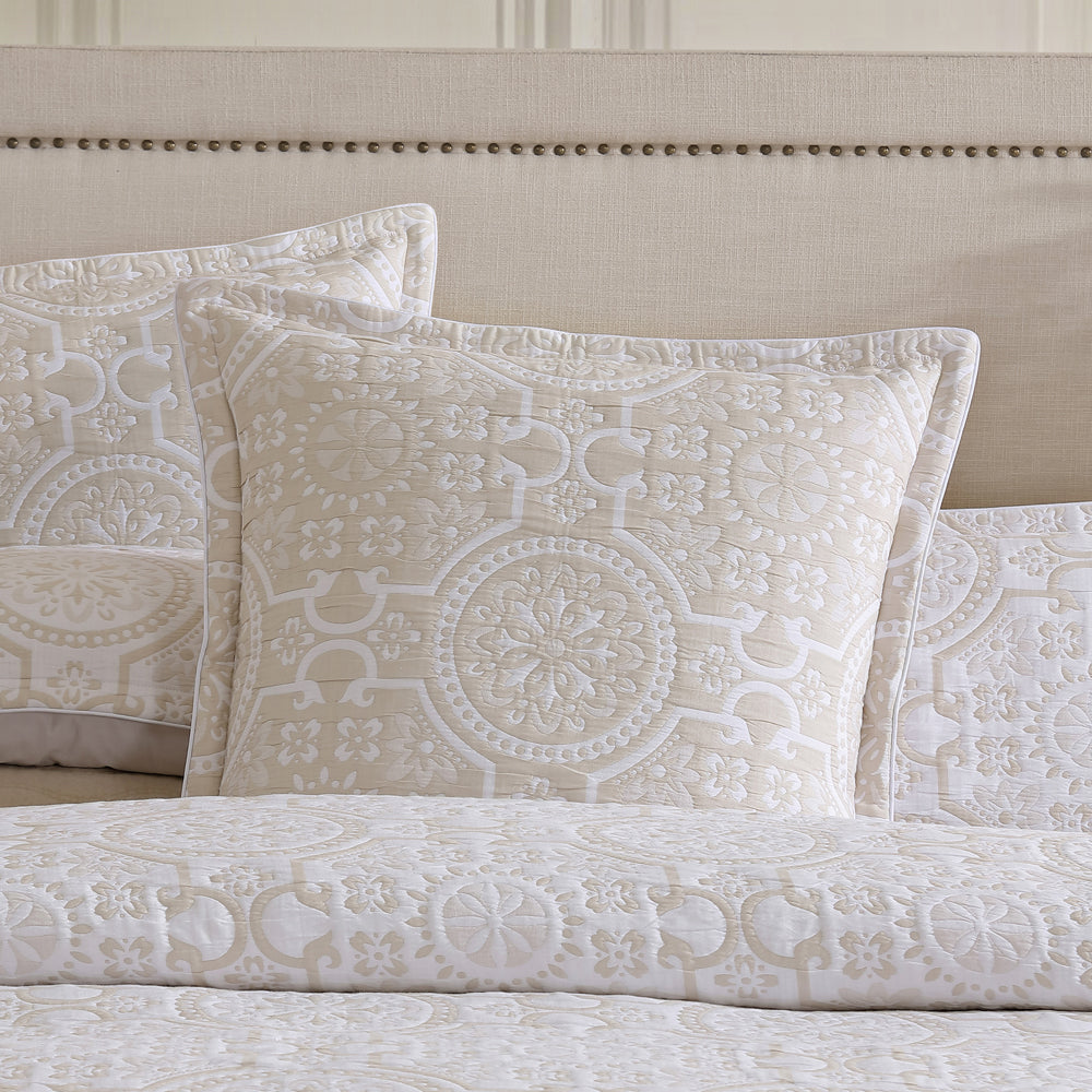 Private Collection Mayfair Stone Square Filled Cushion in soft and refreshing colours for Spring and Summer. A plain stone ground features a decorative array of 'folk art' style motifs in white. The cover is luxuriously quilted for downy-soft texture.