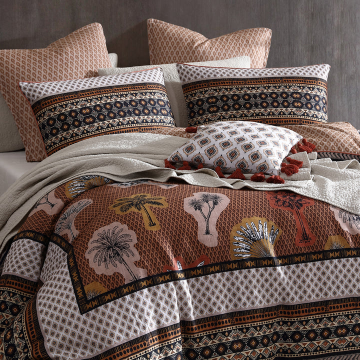 Elevate your bedroom with the Meekah Queen Bed Quilt Cover Set, a stunning blend of tribal influences and warm rust color tones. This exquisite set features a full tribal border that encases captivating palm linear art, creating a striking focal point that brings a touch of cultural richness to your space. The reverse side showcases a subtle tribal geometric pattern with a textured finish, adding depth and sophistication. Whether you're looking to infuse your room with a touch of tradition or simply love the warm, earthy hues, the Meekah Quilt Cover Set offers a perfect harmony of style and comfort.