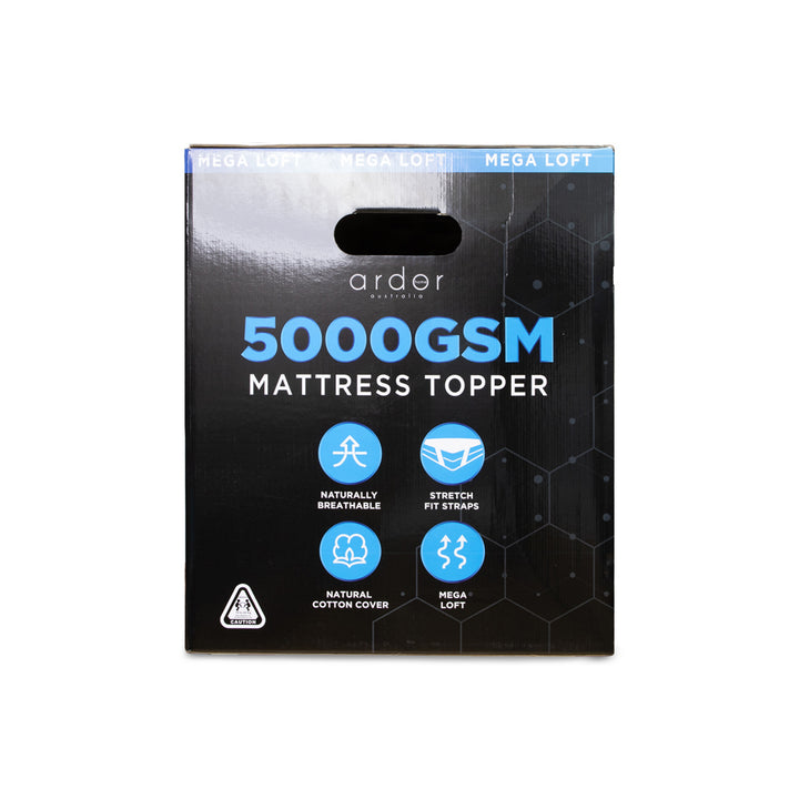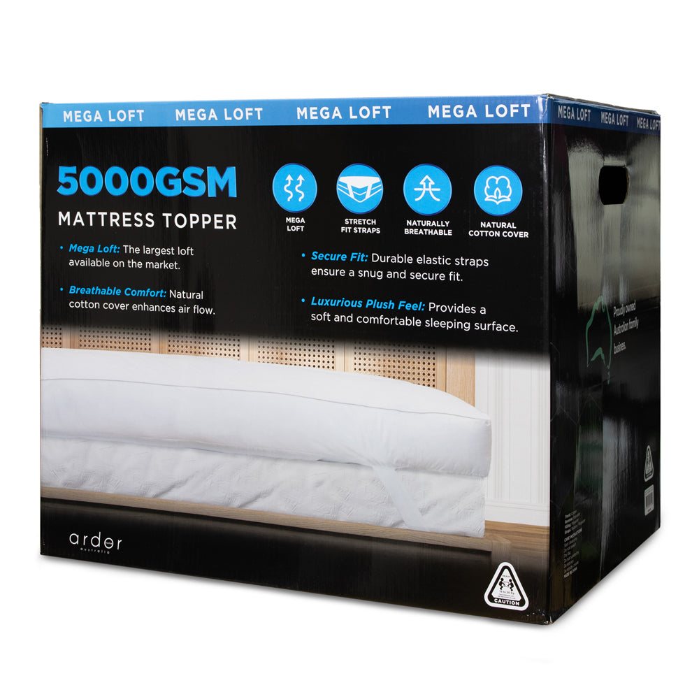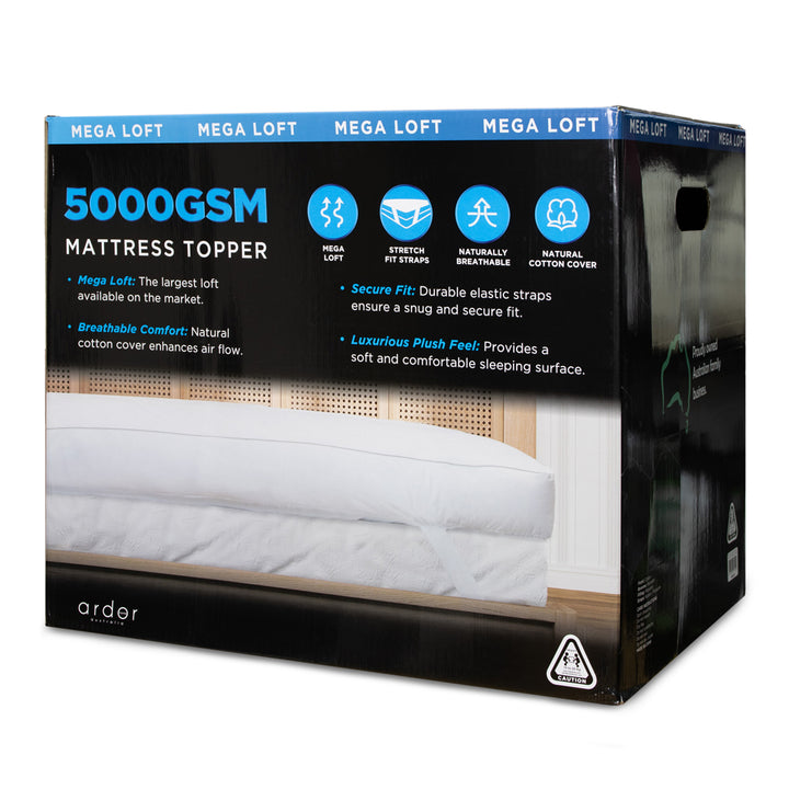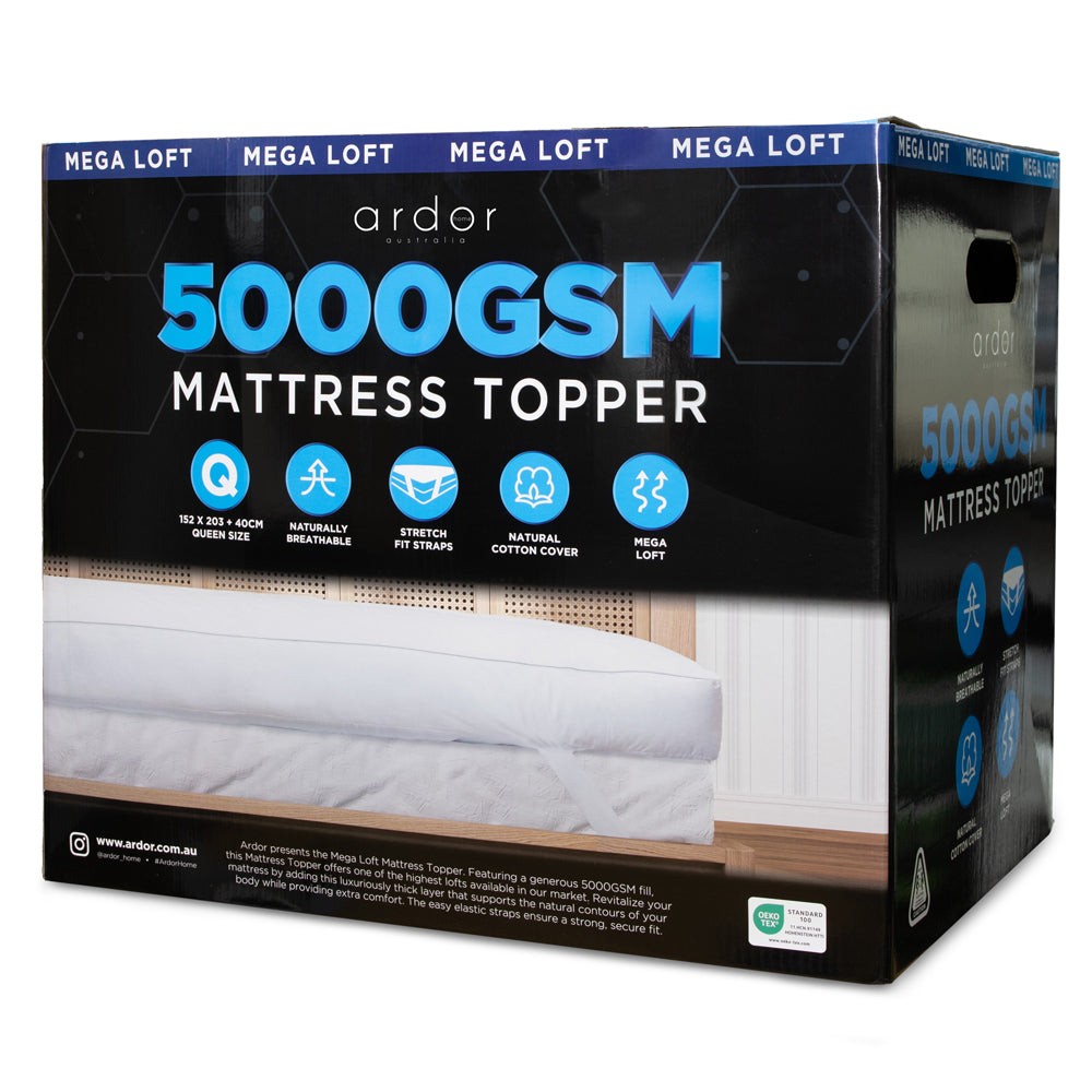 Ardor presents the Mega Loft King Bed Mattress Topper. Featuring a generous 5000GSM fill, this Mattress Topper offers one of the highest lofts available in our market. Revitalize your mattress by adding this luxuriously thick layer that supports the natural contours of your body while providing extra comfort. The easy elastic straps ensure a strong, secure fit.