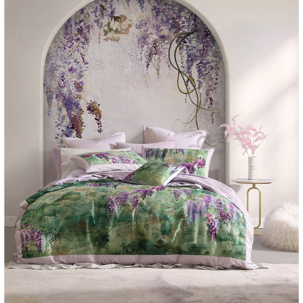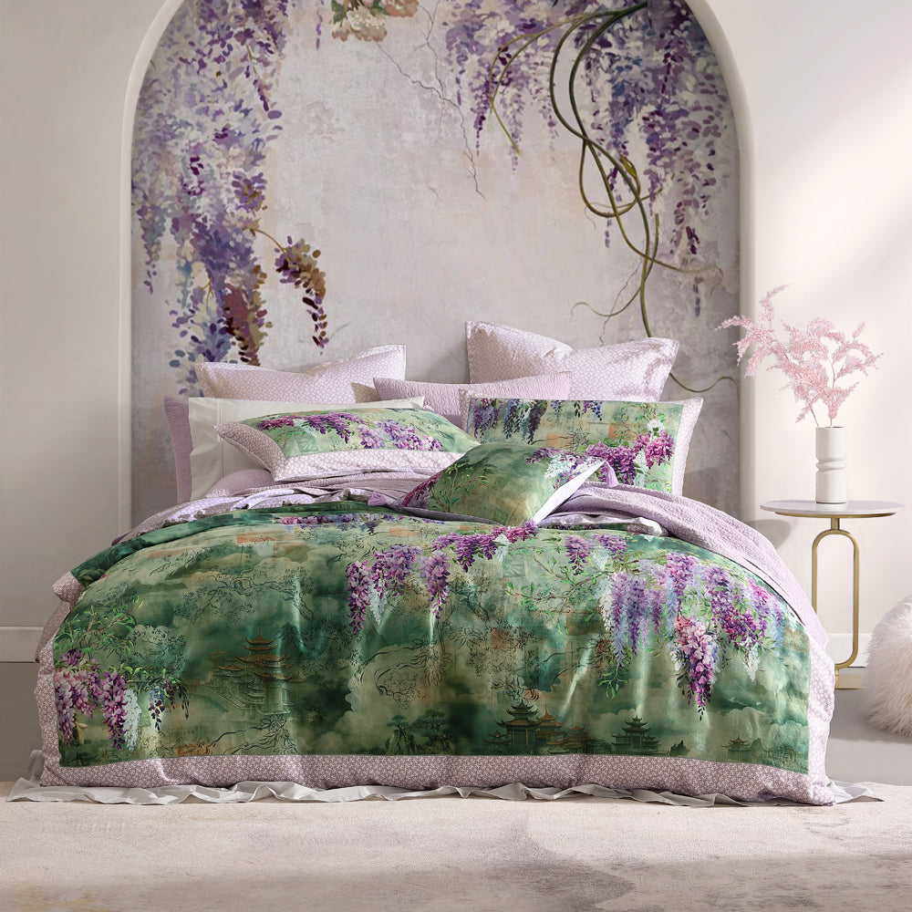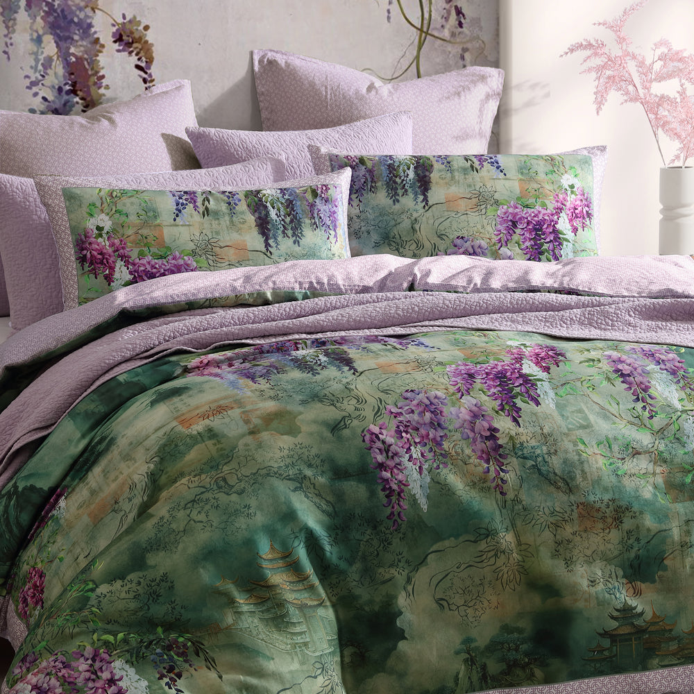 Logan and Mason Miko King bed quilt cover set is a Japanese-inspired garden featuring delicate Wisteria blooms. The harmonious blend of soft lilacs and jade hues creates an enchanting atmosphere, evoking a sense of peaceful contemplation and natural beauty. The vintage, Japanese-textured Jade -toned base sets the stage for the magnificent garden design. The floral masterpiece is framed within a Japanese geo print in lilac and white, adding a touch of sophistication and cultural richness. This elegant design flows seamlessly onto the reverse side, ensuring a stylish look.