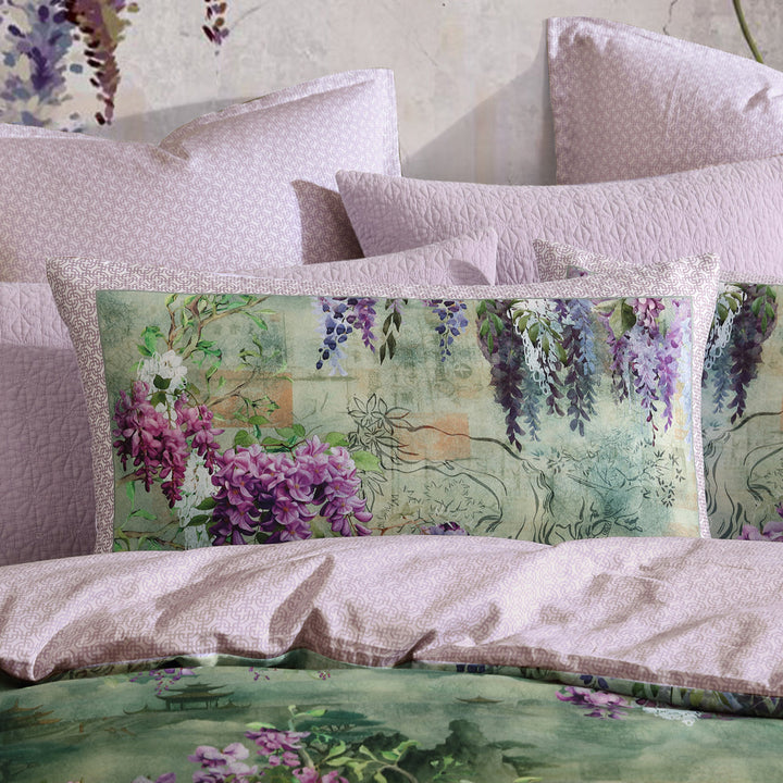 Logan and Mason Miko Super King quilt cover set is a Japanese-inspired garden featuring delicate Wisteria blooms. The harmonious blend of soft lilacs and jade hues creates an enchanting atmosphere, evoking a sense of peaceful contemplation and natural beauty. The vintage, Japanese-textured Jade -toned base sets the stage for the magnificent garden design. The floral masterpiece is framed within a Japanese geo print in lilac and white, adding a touch of sophistication and cultural richness. This elegant design flows seamlessly onto the reverse side, ensuring a stylish look.